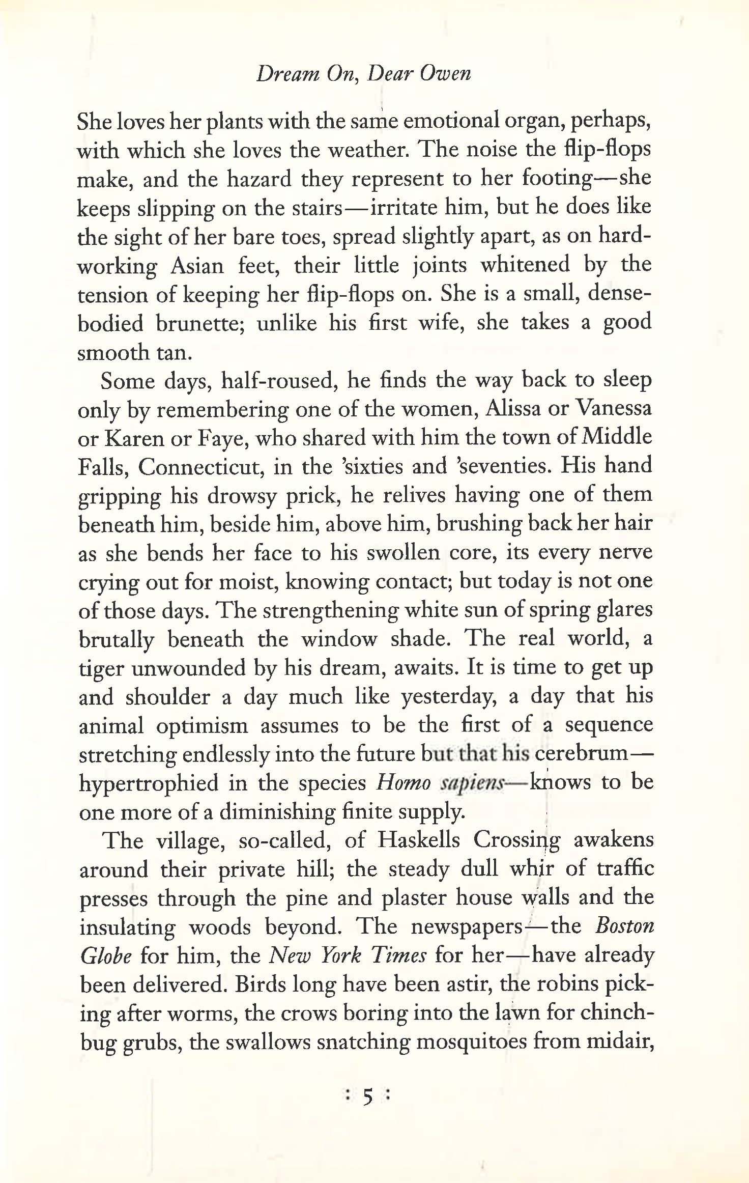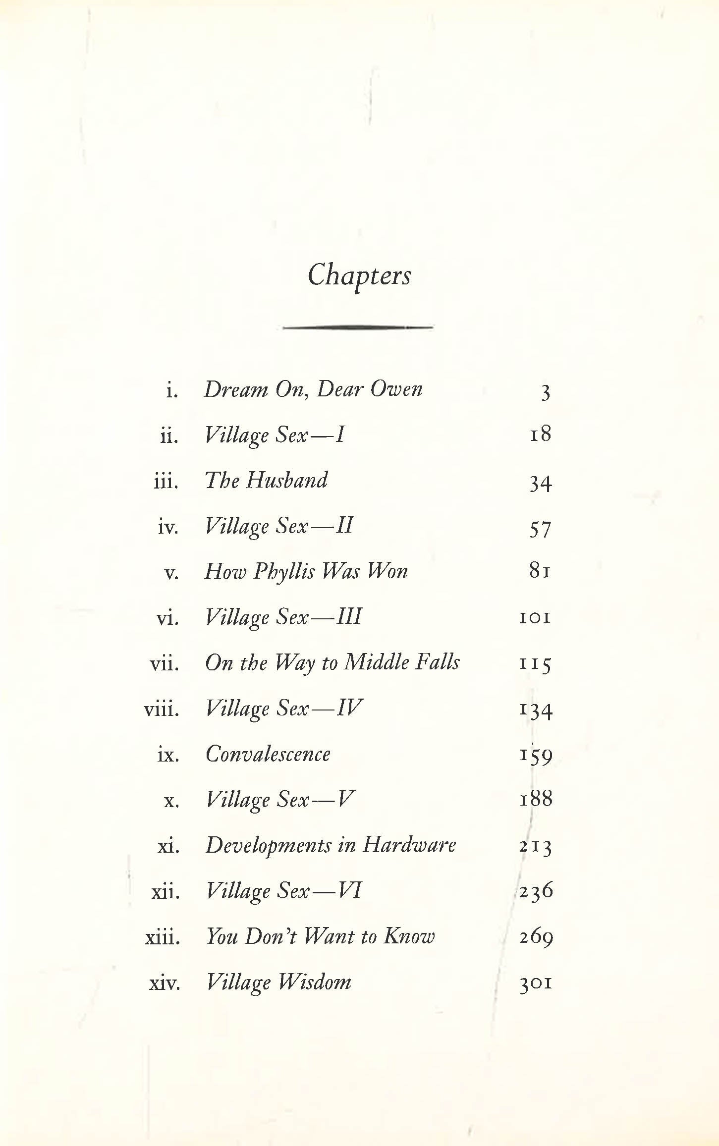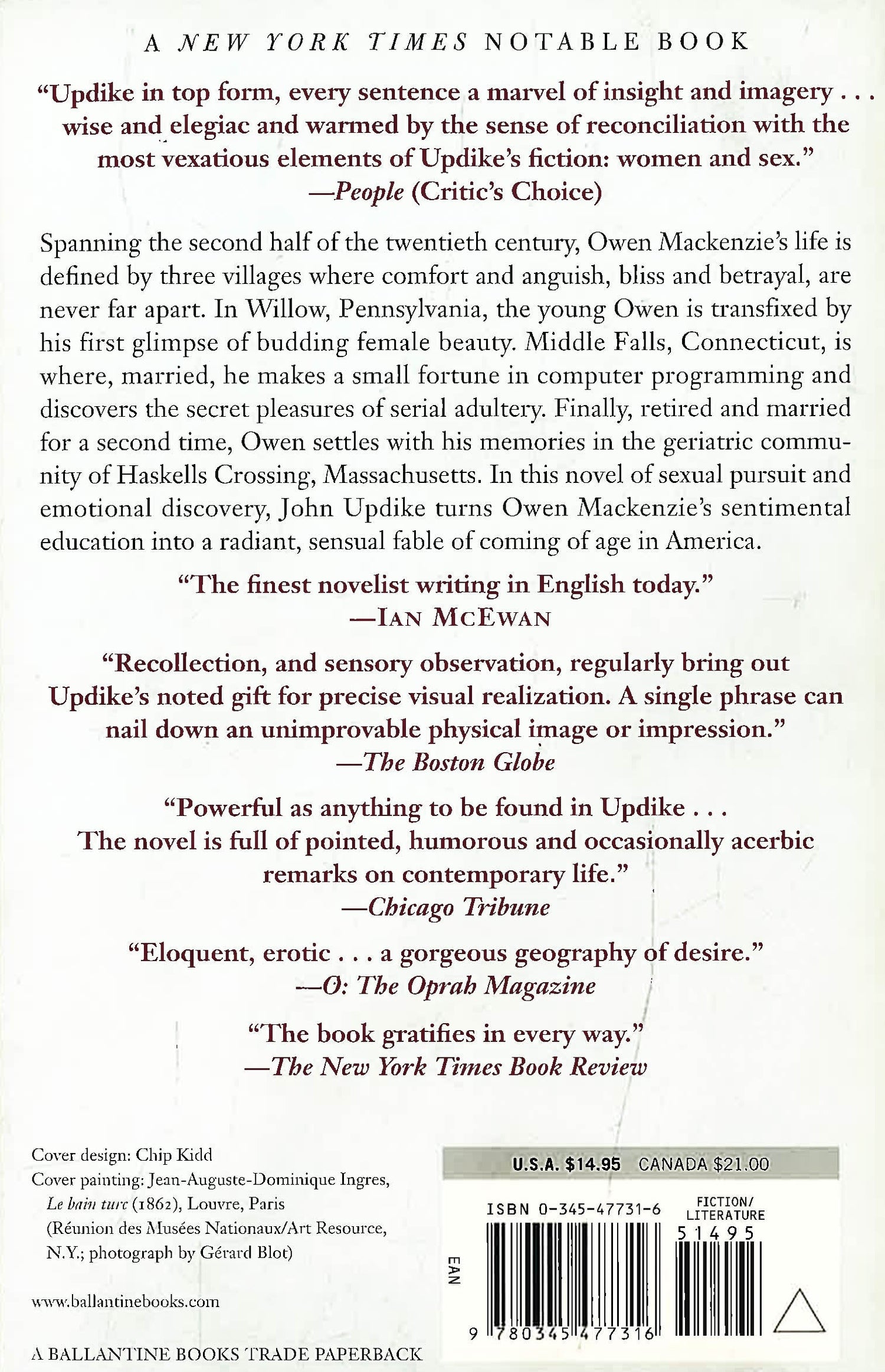 In this wry novel of sentimental education and sexual pursuit, we follow Owen Mackenzie, a representative man of the author's generation, from cradle to grave, and from bed to bed. His life and relationships are shaped by three villages, warm-lit communities that keep the darkness at bay from within and without. In Willow, Pennsylvania, the young Owen is transfixed by his first glimpses of female beauty. In Middle Falls, Connecticut, he marries, becomes a first-wave computer programmer, and discovers the very grownup pleasures of serial adultery. Finally, married for a second time, he retires with his memories, illusions, and fantasies to the somewhat geriatric community of Haskells Crossing, Massachusetts. John Updike turns Owen's personal odyssey into a radiant, sensual fable of the seasons of a man's life--and of the getting of wisdom in America.