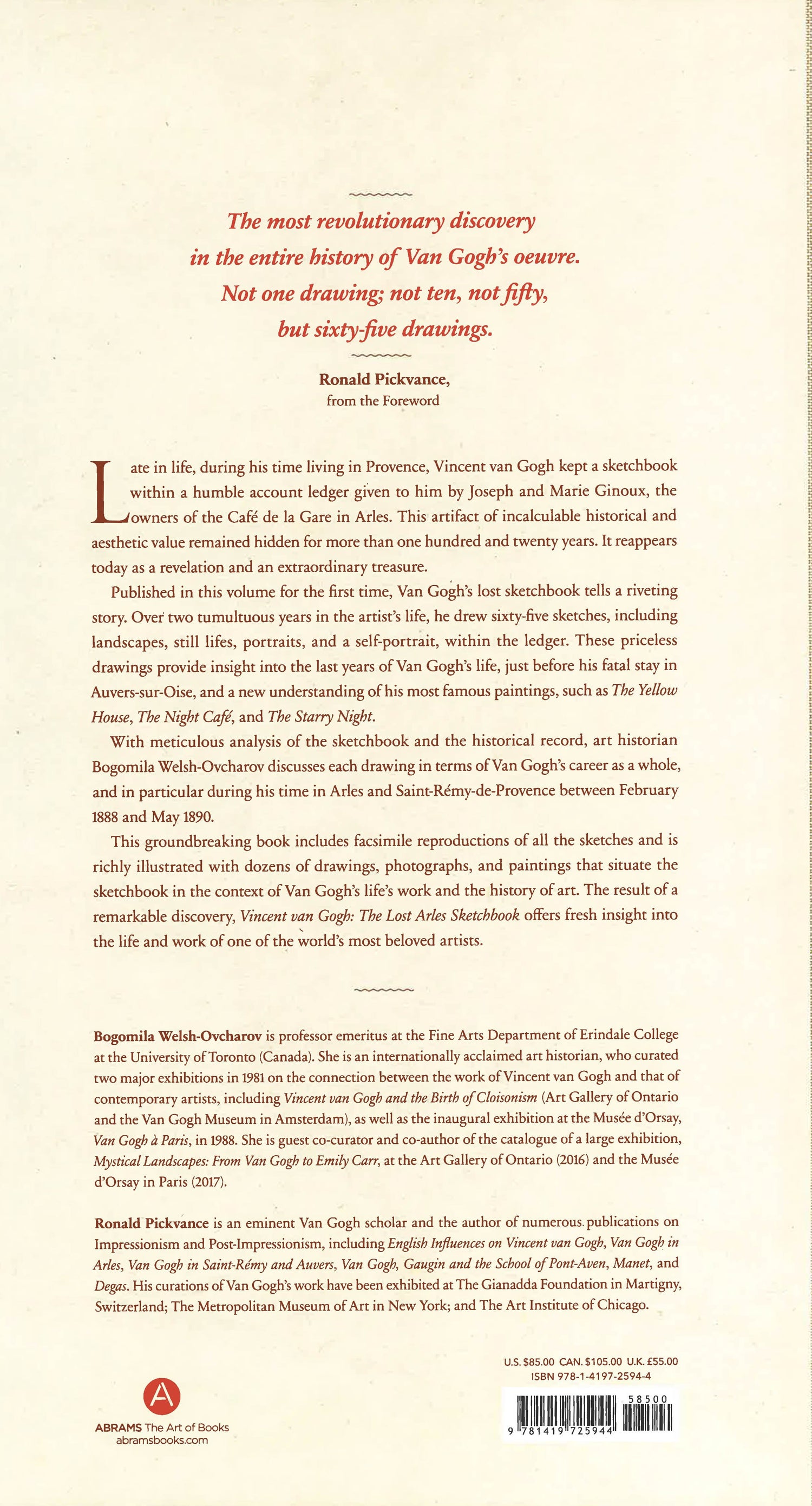 “The most revolutionary discovery in the entire history of Van Gogh’s oeuvre. Not one drawing; not ten, not fifty, but sixty-five drawings.” —Ronald Pickvance, from the Foreword.Late in life, during his time living in Provence, Vincent van Gogh kept a sketchbook within a humble account ledger given to him by Joseph and Marie Ginoux, the owners of the Café de la Gare in Arles. This artifact of incalculable historical and aesthetic value remained hidden for more than one hundred and twenty years. It reappears today as a revelation and an extraordinary treasure. Published in this volume for the first time, Van Gogh’s lost sketchbook tells a riveting story. Over two tumultuous years in the artist’s life, he drew sixty-five sketches, including landscapes, still lifes, portraits, and a self-portrait, within the ledger. These priceless drawings provide insight into the last years of Van Gogh’s life, just before his fatal stay in Auvers-sur-Oise, and a new understanding of his most famous paintings, such as The Yellow House, The Night Café, and The Starry Night. With meticulous analysis of the sketchbook and the historical record, art historian Bogomila Welsh-Ovcharov discusses each drawing in terms of Van Gogh’s career as a whole, and in particular during his time in Arles and Saint-Rémy-de-Provence between February 1888 and May 1890.