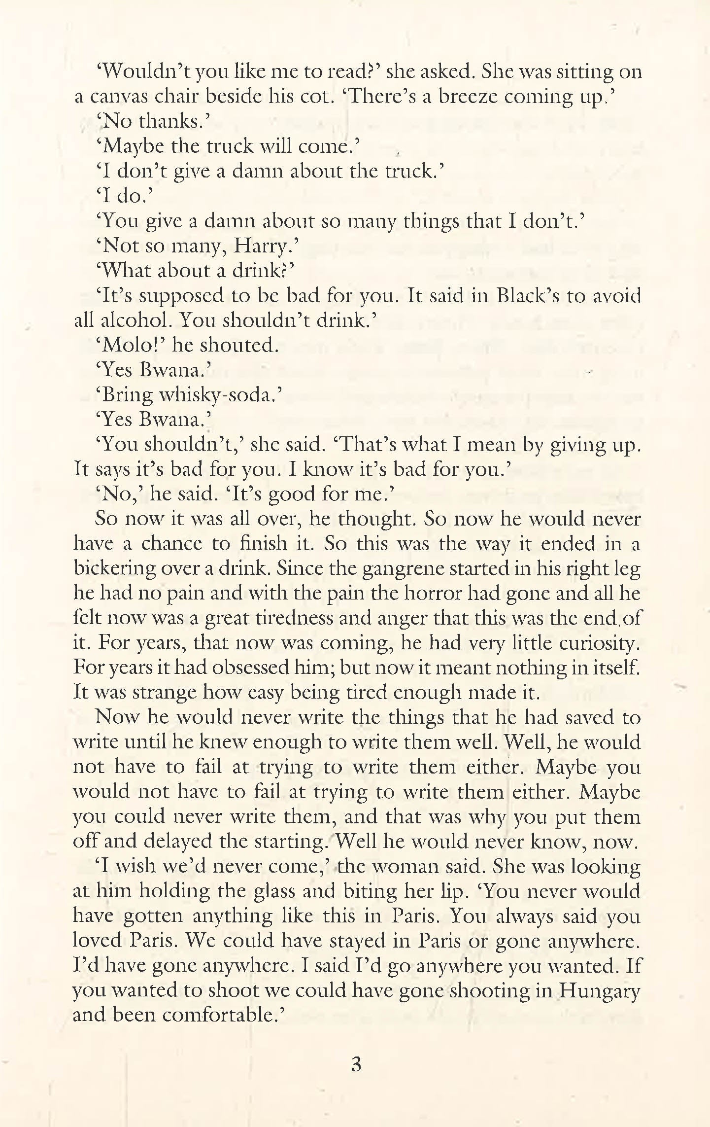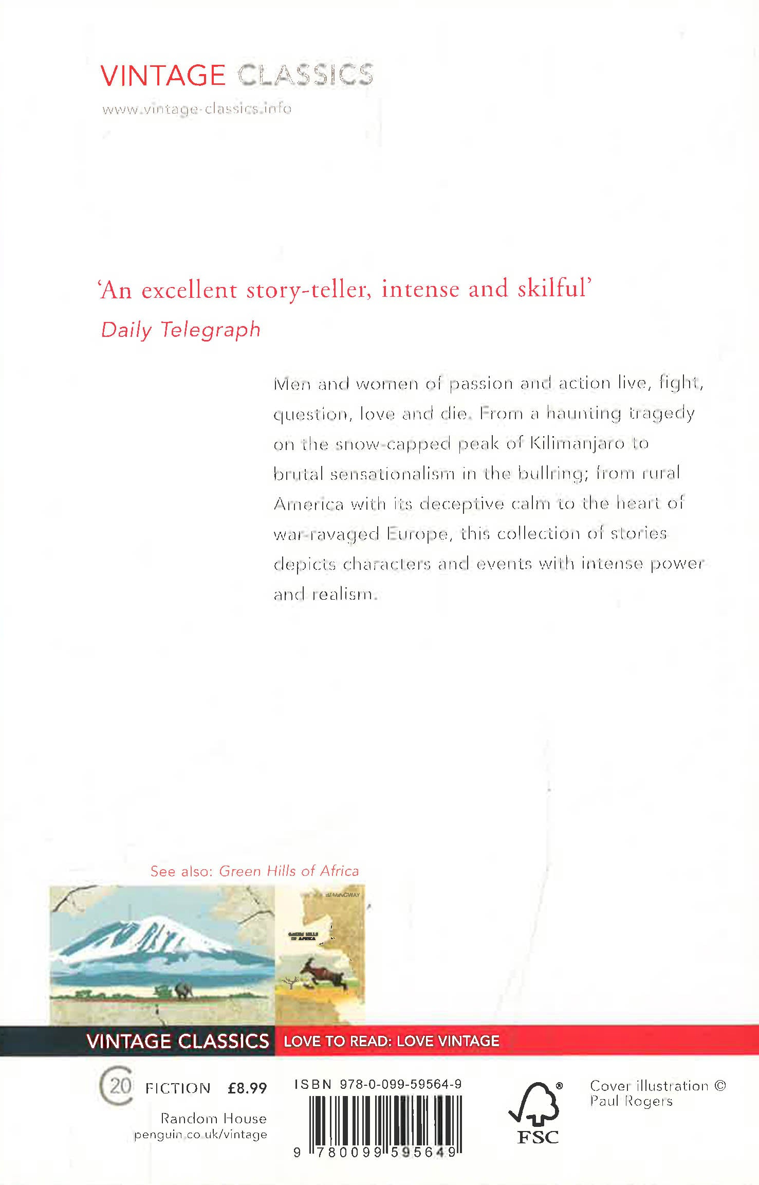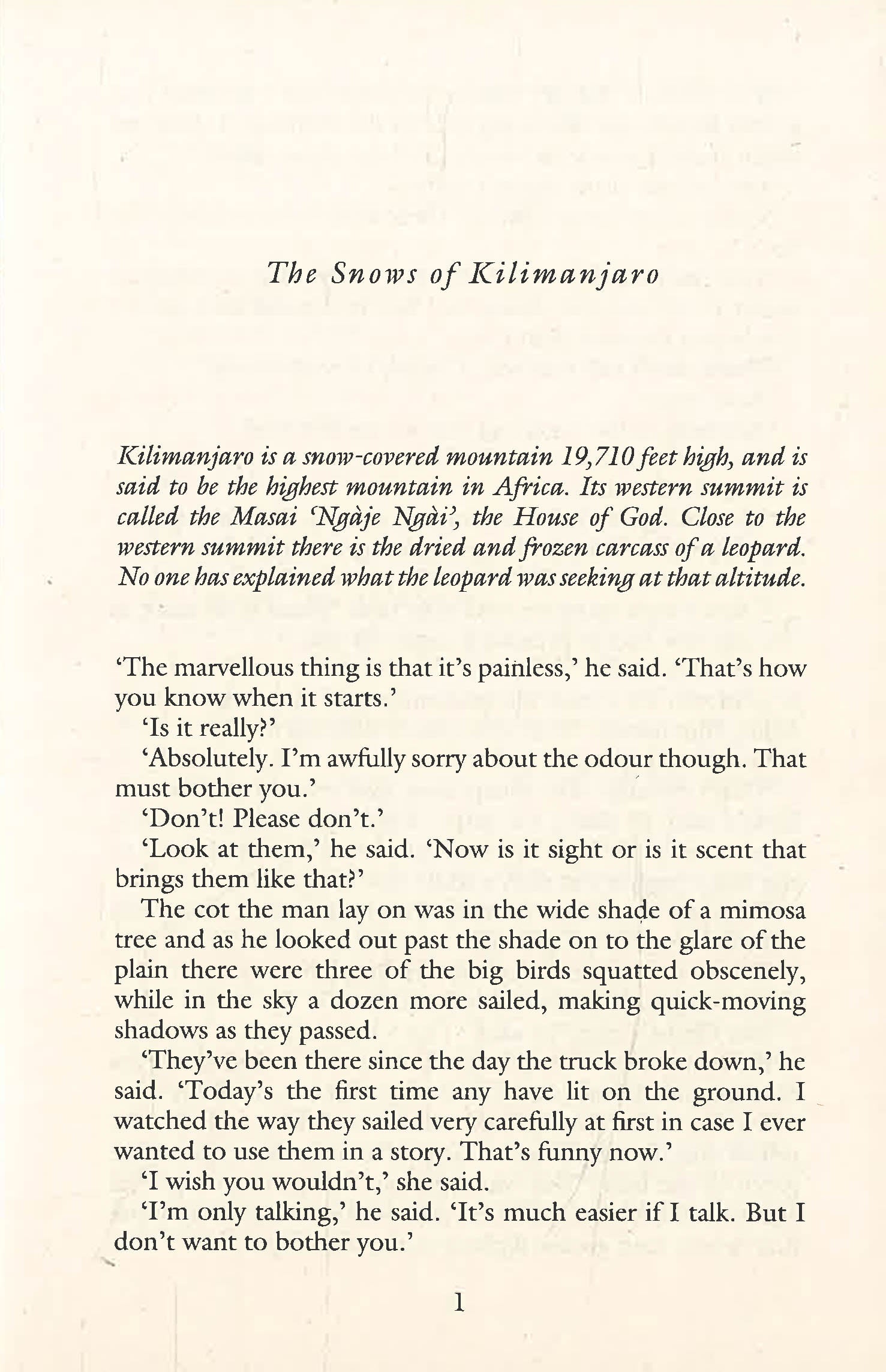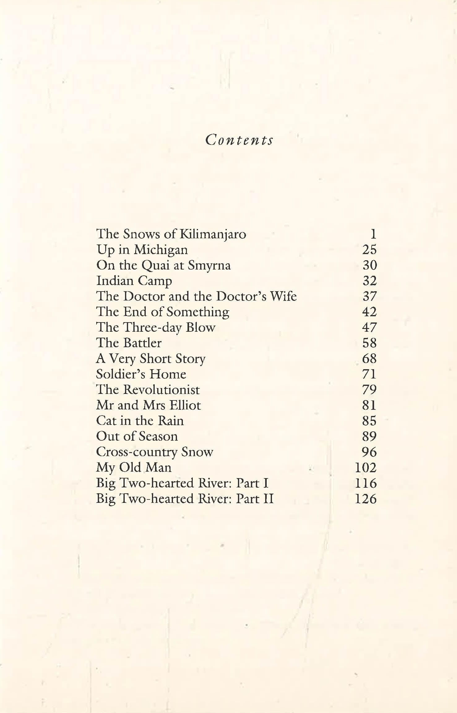 The Snows Of Kilimanjaro (And Other Stories)': Vintage Classics 2004 paperback edition, 137 pages. Contains the short stories: Snows of Kilimanjaro, Up in Michigan, On the Quai at Smyrna, Indian Camp, Doctor and the Doctor's Wife, End of Something, Three-Day Blow, Battler, Very Short Story, Soldier's Home, Revolutionist, Mr and Mrs Elliot, Cat in the Rain, Out of Season, Cross-Country Snow, My Old Man, Big Two-Hearted River Parts 1 and 2.
