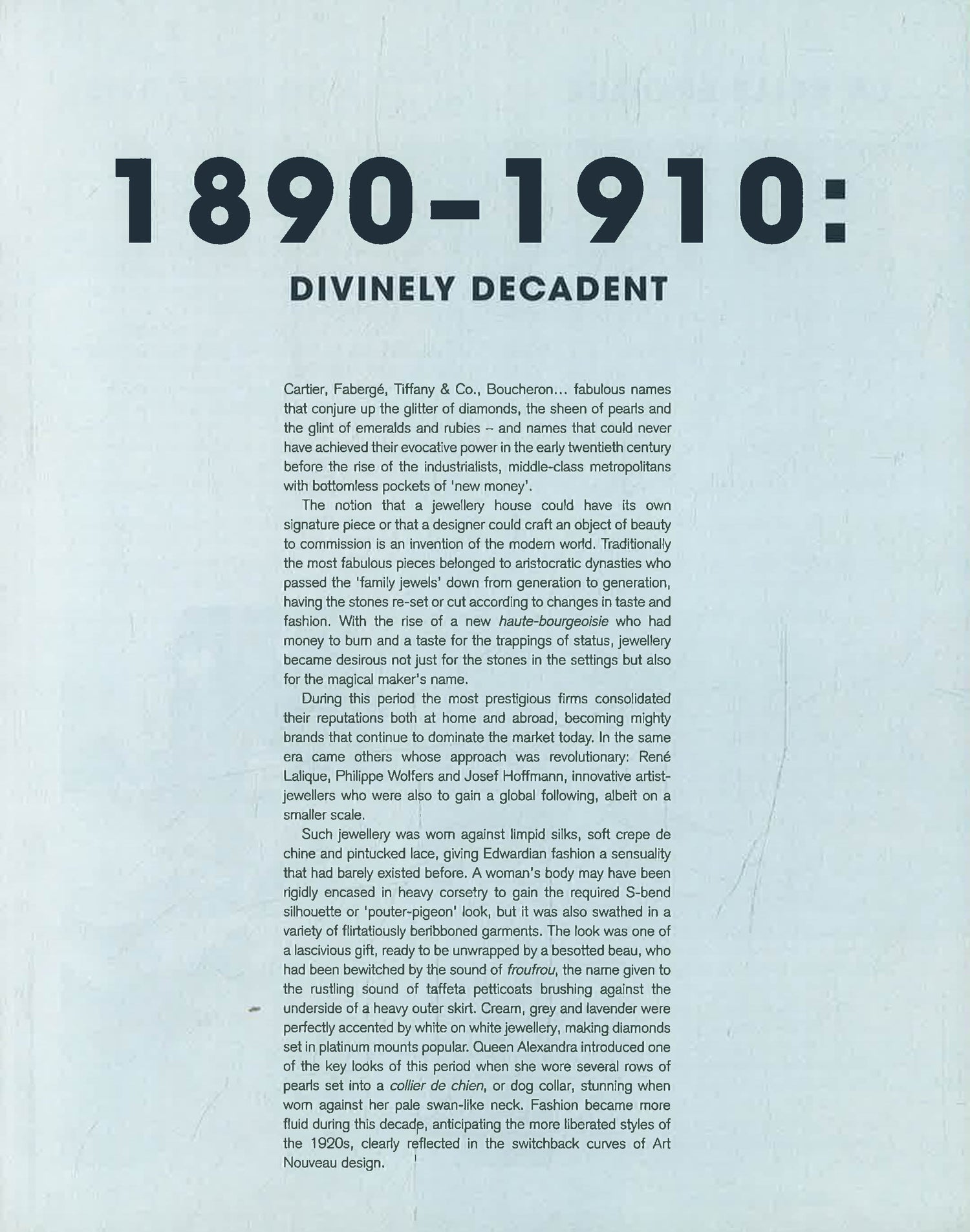 Vintage Jewellery recounts 120 years of history, including Lalique's Art Nouveau enamelling at the turn of the twentieth century, Cartier's gemstones, Christian Dior's mid-century costume pieces and Harry Winston's diamonds.