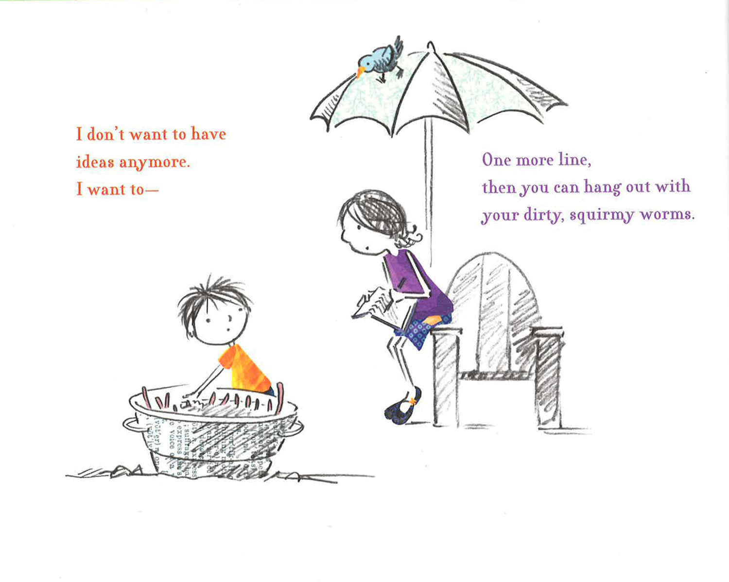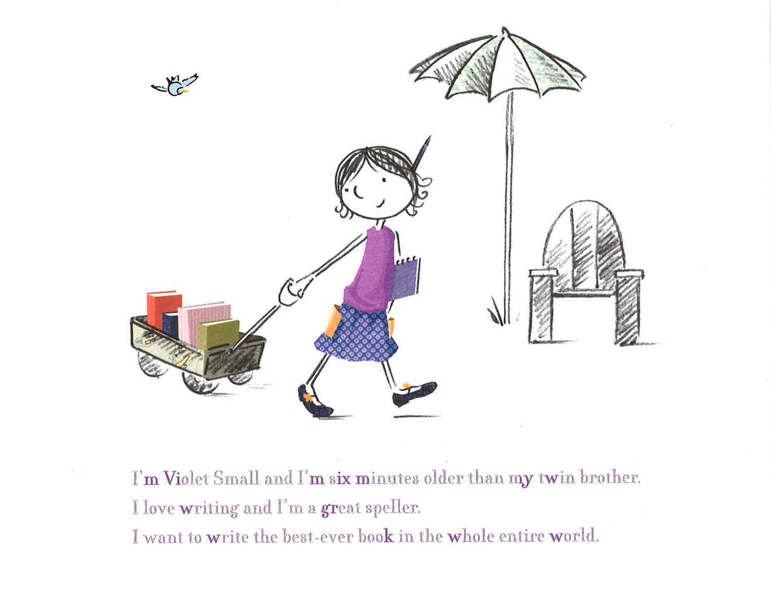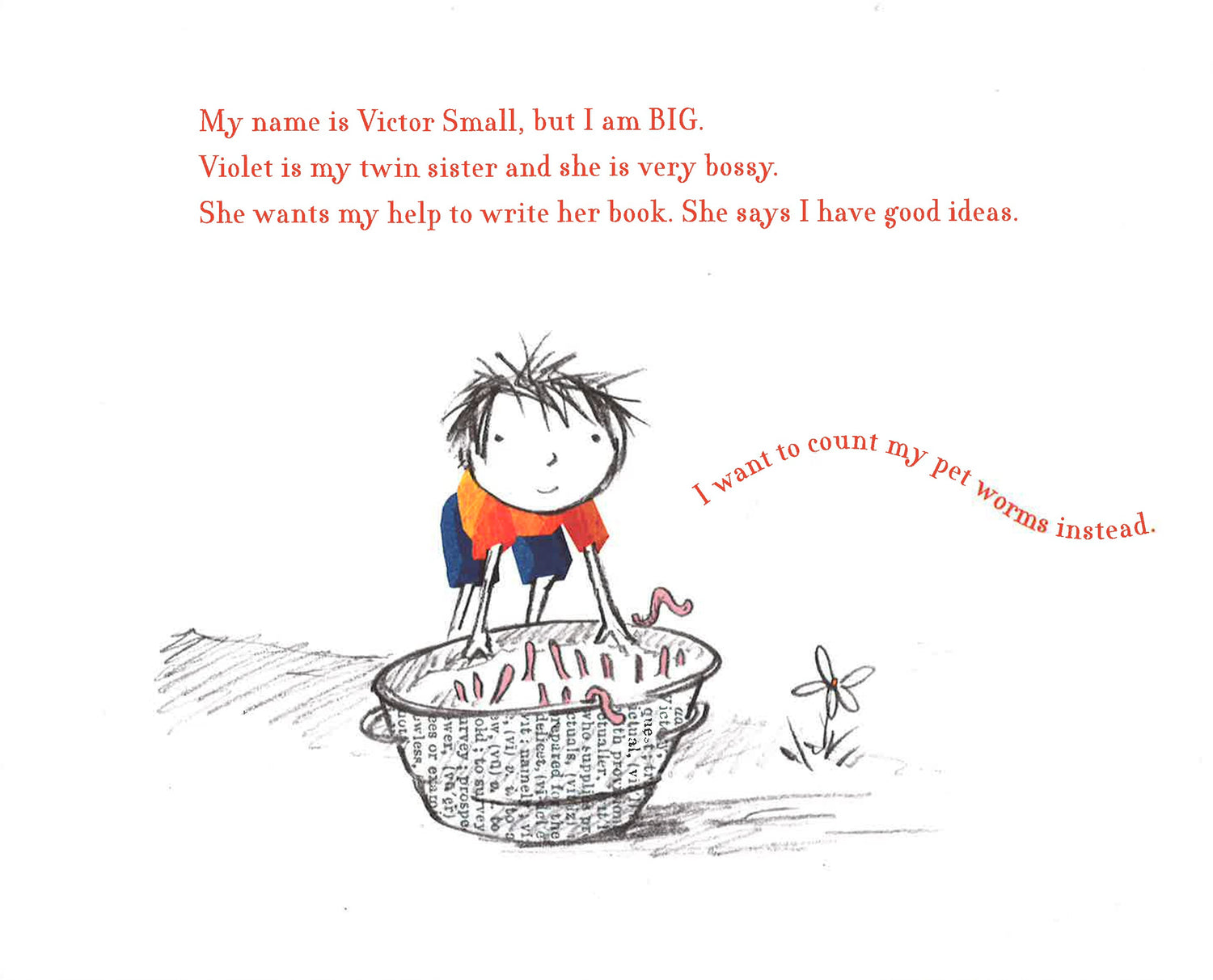 Violet and Victor Small are twins on a mission: to write the best book in the whole, entire world--together! Victor is reluctant, but Violet is determined, and soon the ideas can't come quickly enough. They begin to write a story about a hungry Bookworm who is eating all the books in the library. Thanks to Victor's brilliant ideas, Violet is able to save the day (and the library).This delightful story-within-a-story is filled with good-natured sibling rivalry, and focuses on the spirit of cooperation, the satisfaction of a job well-done, and the magic of storytelling.