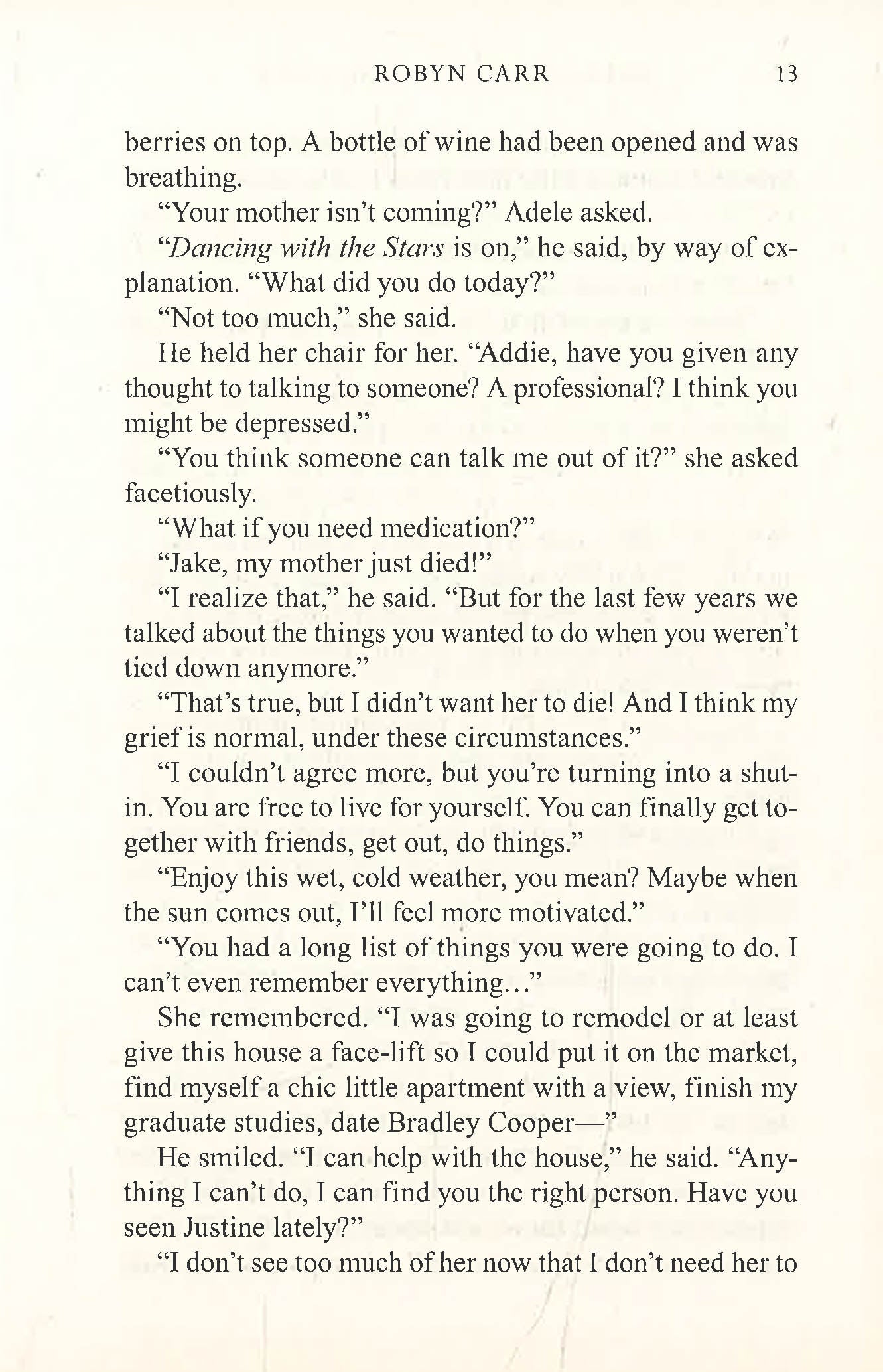 Addie had great plans for her life but has been worn down by the pressures of being a caregiver and doesn't know how to live for herself. And Justine's success has come at a price. Her marriage is falling apart despite her best efforts.