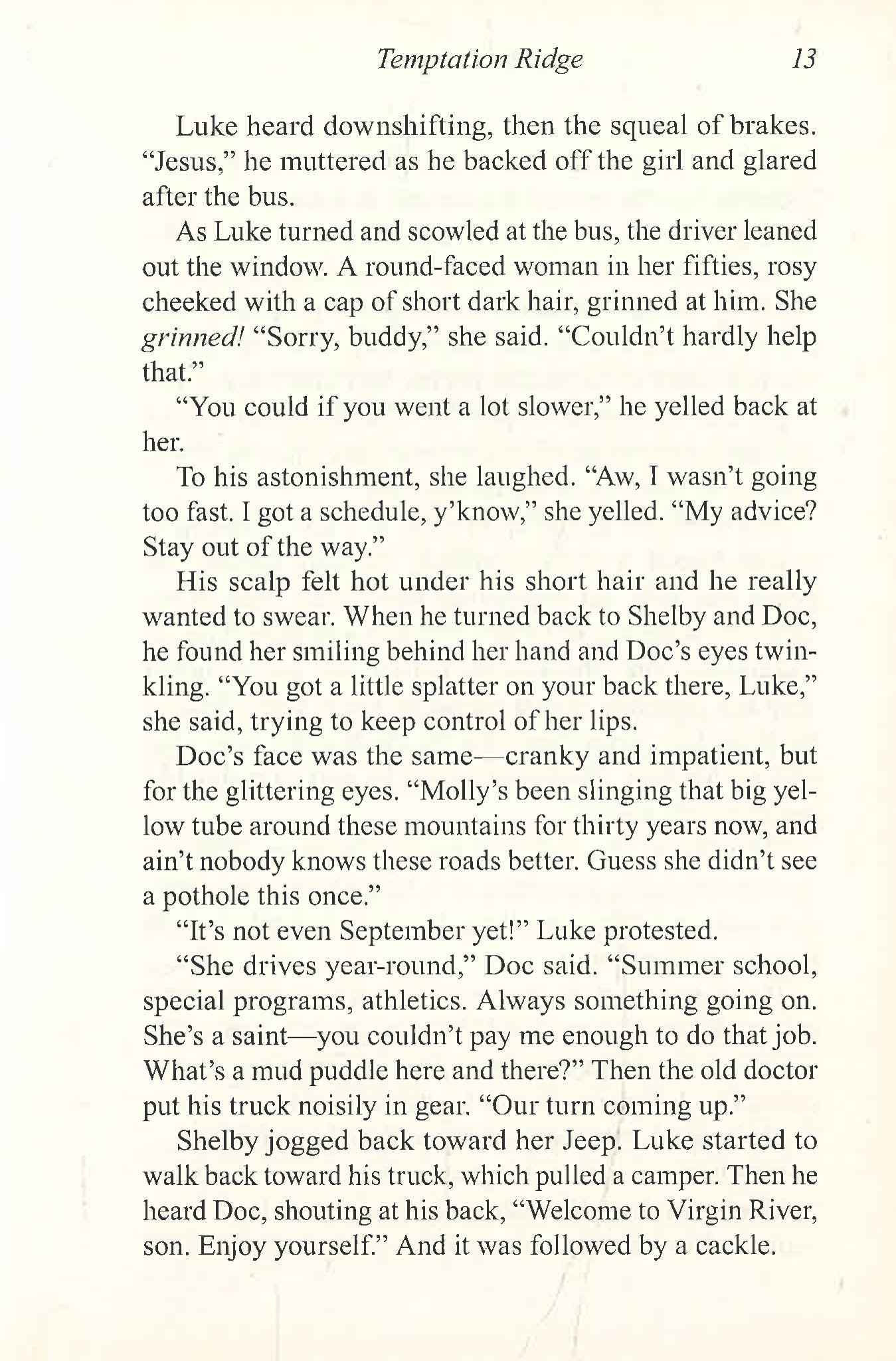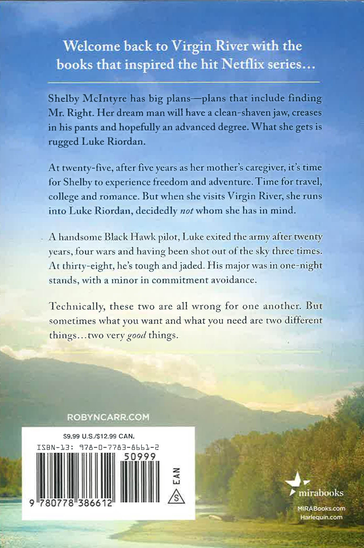 At twenty-five, after five years as her mother's caregiver, it's time for Shelby to experience freedom and adventure. Time for travel, college and romance. But when she visits Virgin River, she runs into Luke Riordan, decidedly not whom she has in mind.