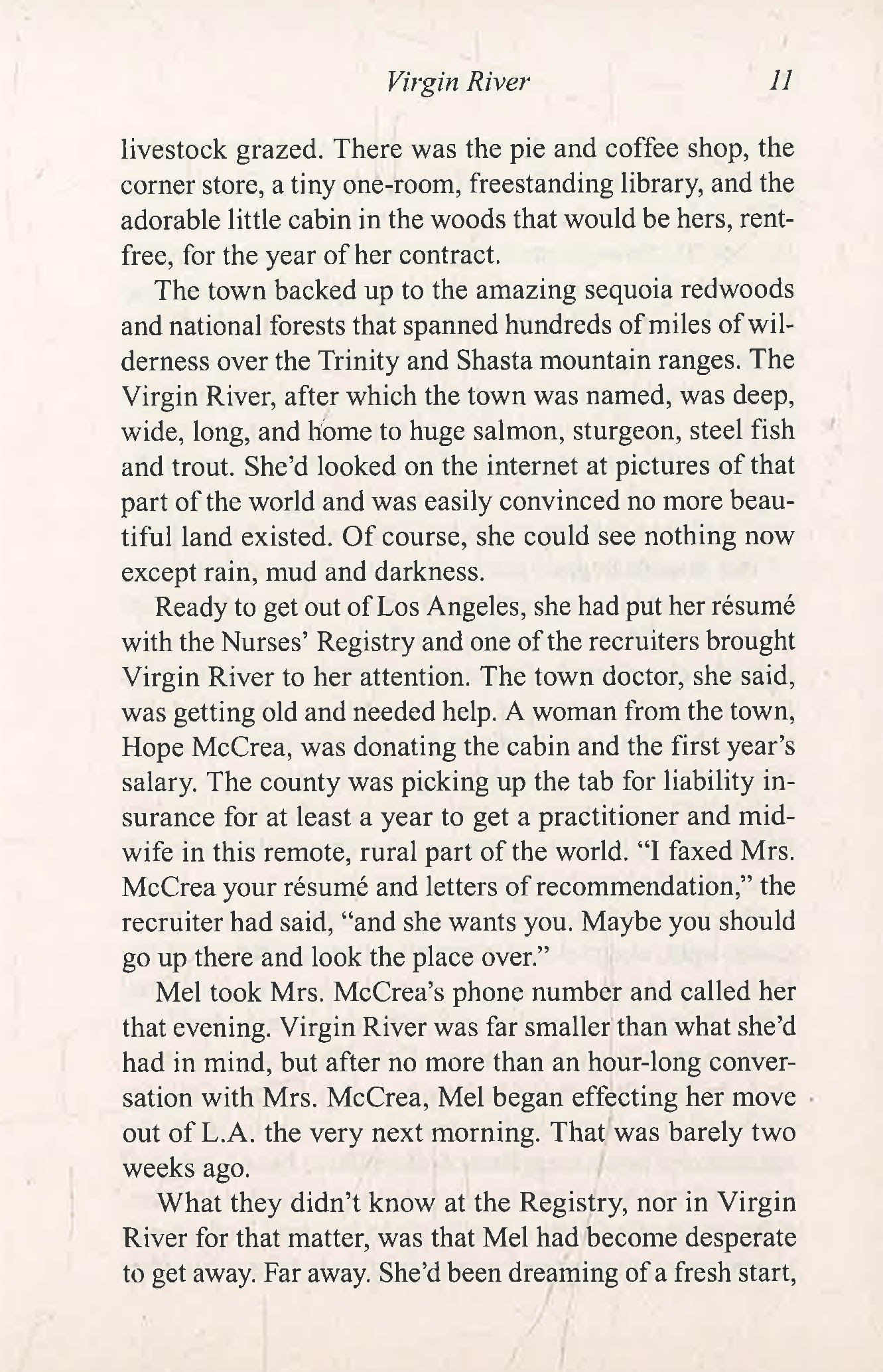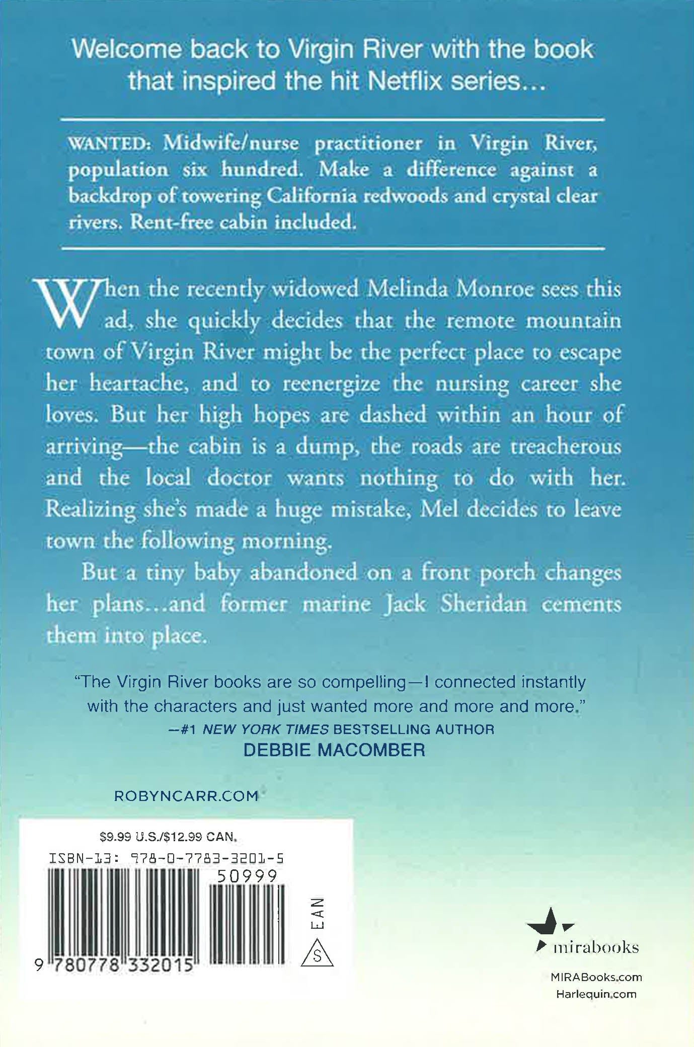 Wanted: Midwife/nurse practitioner in Virgin River, population six hundred. Make a difference against a backdrop of towering California redwoods and crystal clear rivers. Rent-free cabin included.