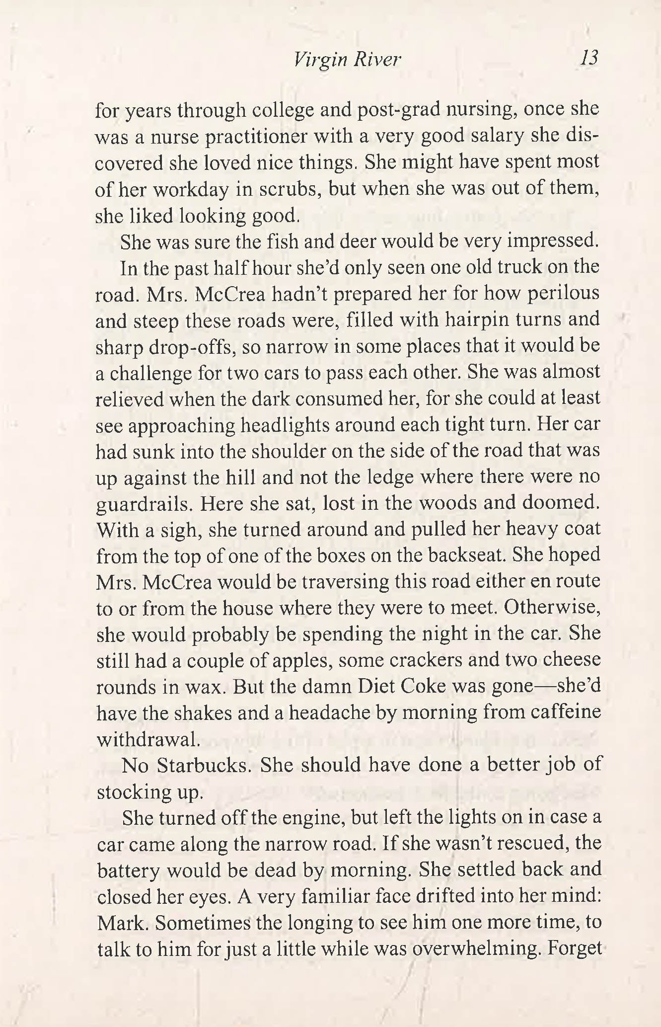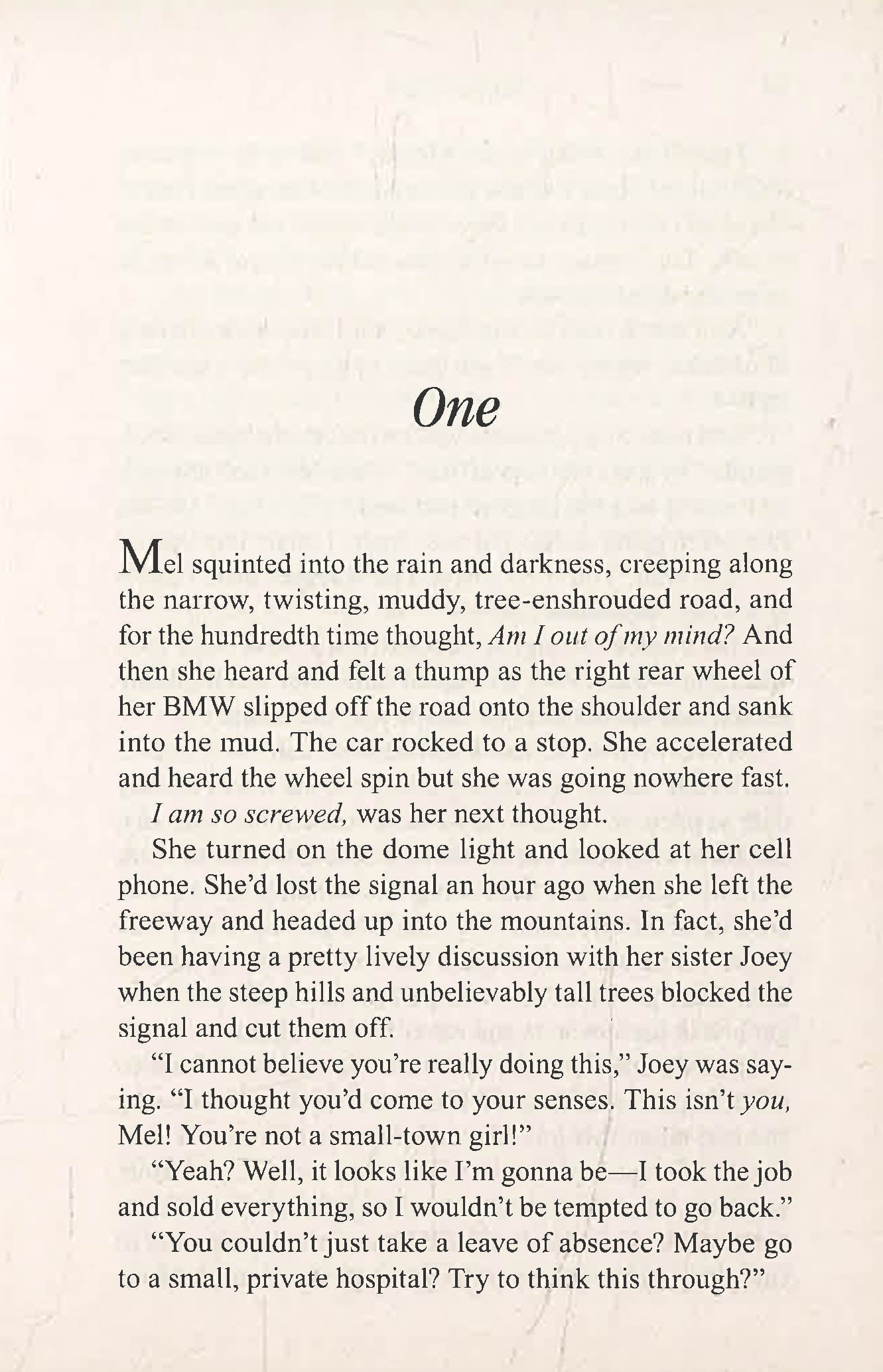 When the recently widowed Melinda Monroe sees this ad, she quickly decides that the remote mountain town of Virgin River might be the perfect place to escape her heartache and to reenergize the nursing career she loves. But her high hopes are dashed within an hour of arriving—the cabin is a dump, the roads are treacherous and the local doctor wants nothing to do with her. Realizing she's made a huge mistake, Mel decides to leave town the following morning.