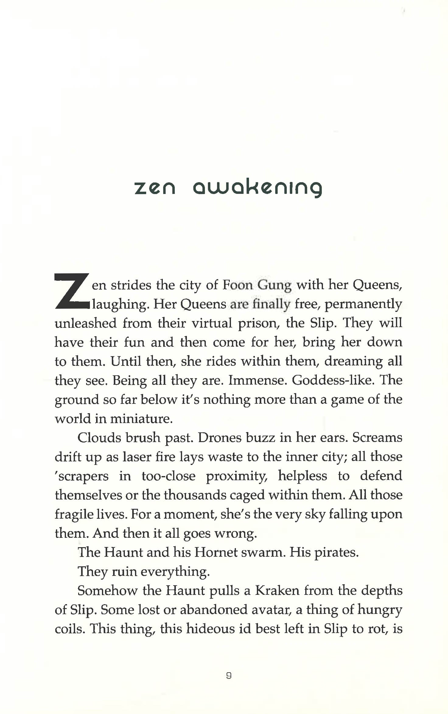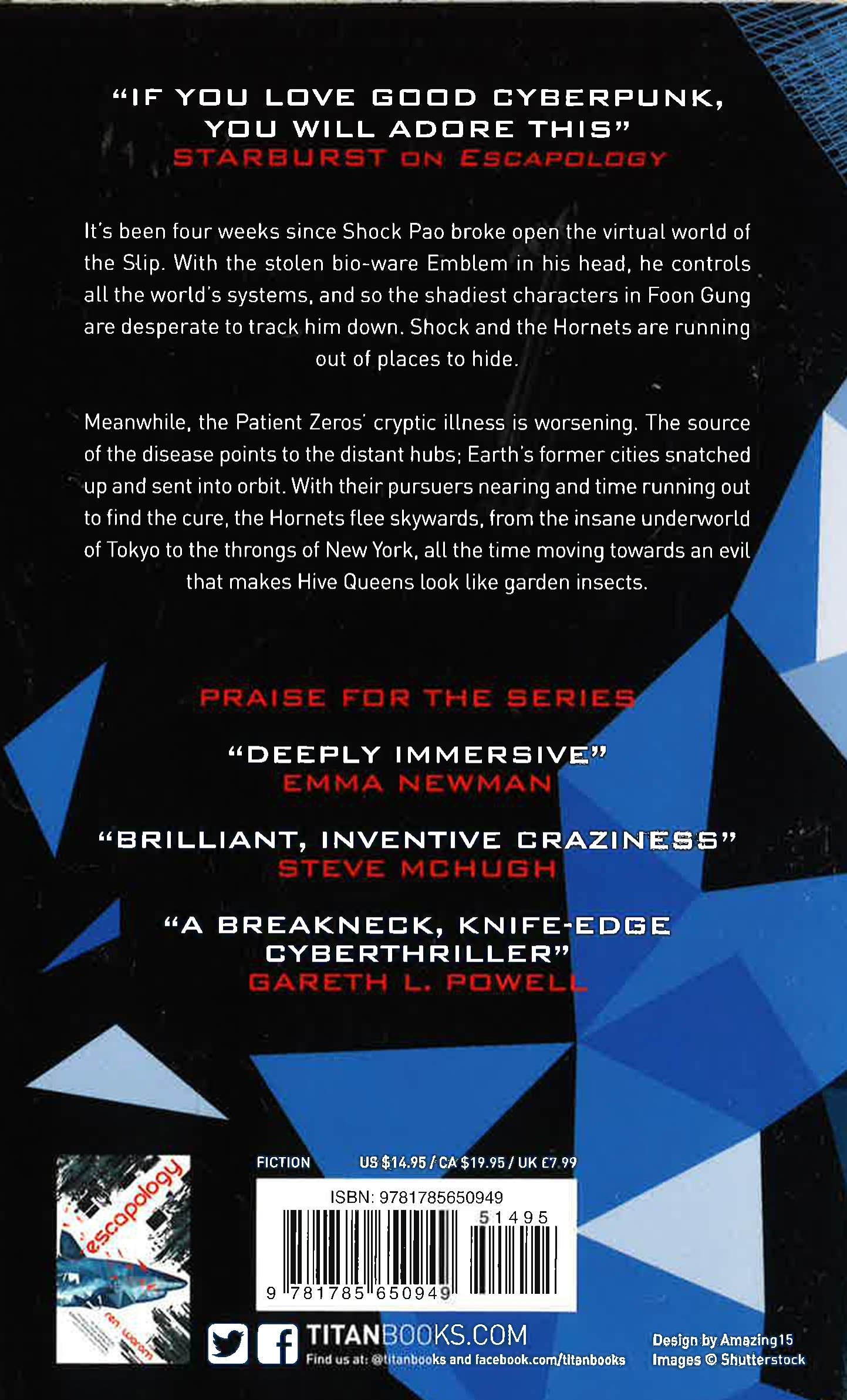 It’s been four weeks since Shock Pao broke open the virtual world of the Slip. With the stolen bio-ware Emblem in his head, he controls all the world’s systems, and so the shadiest characters in Foon Gung are desperate to track him down. Shock and the Hornets are running out of places to hide. Meanwhile, the Patient Zeros’ cryptic illness is worsening. The source of the disease points to the distant hubs; Earth’s former cities snatched up and sent into orbit. With their pursuers nearing and time running out to find the cure, the Hornets flee skywards, from the insane underworld of Tokyo to the throngs of New York, all the time moving towards an evil that makes Hive Queens look like garden insects.