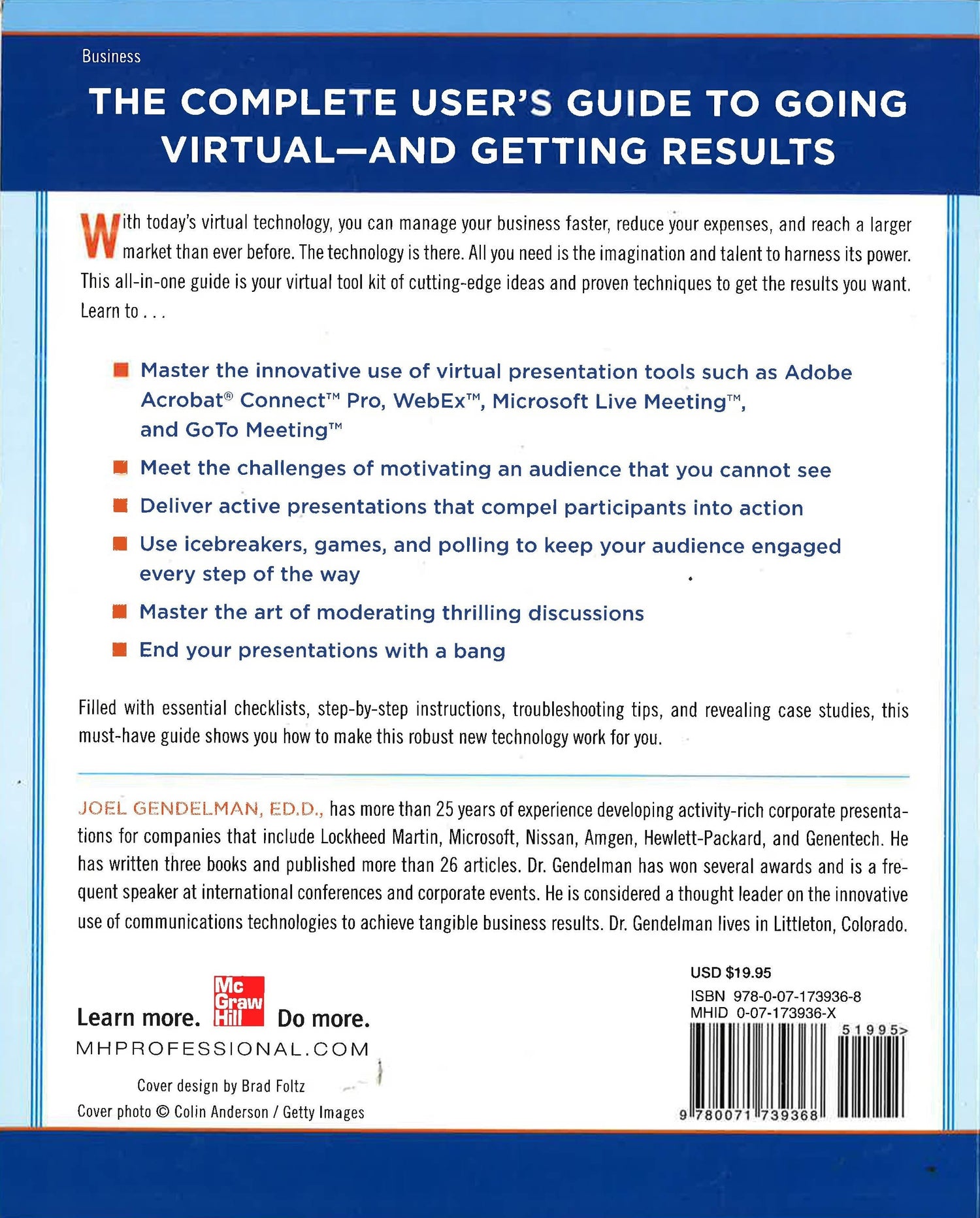 Master the innovative use of virtual presentation tools such as AdobeAcrobat Connect Pro, WebEx, Microsoft Live Meeting,and GoTo MeetingMeet the challenges of motivating an audience that you cannot seeDeliver active presentations that compel participants into actionUse icebreakers, games, and polling to keep your audience engaged every step of the wayMaster the art of moderating thrilling discussionsEnd your presentations with a bang