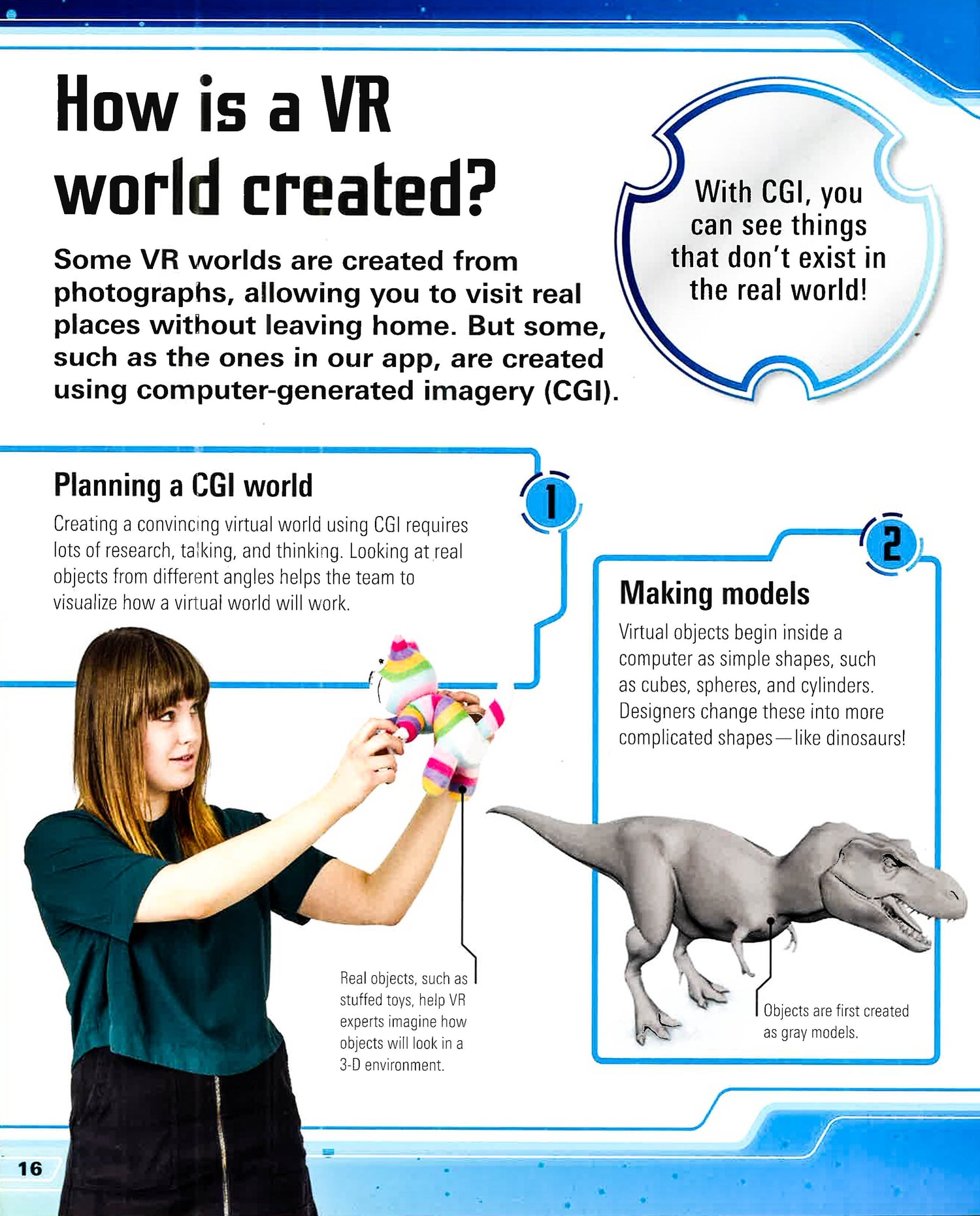 Learn about the history of VR, from how it was invented to how it is used in the world today--beyond smart phone apps--and how VR headsets play with your senses of sight, sound, and touch to fool you into thinking you are somewhere else. Then use the included VR viewer and smartphone app download to come face-to-face with a T. rex, look inside a volcano, explore the Roman Colosseum, hop aboard the International Space Station, and peek under the surface of a pond.