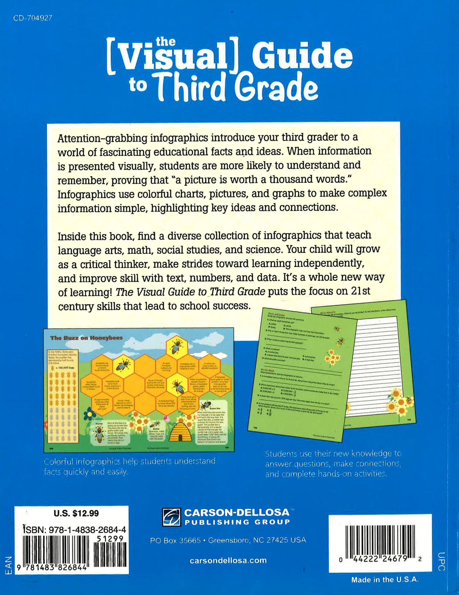 When information is presented visually, children are more likely to understand and remember it. The Visual Guide to Third Grade uses infographics to grab young learners' attention with an exciting visual learning technique. Infographics simplify complex information by highlighting key ideas and connections with colorful charts, pictures, and graphs. The perfect at-home resource, this cross-curricular workbook provides comprehension questions, writing prompts, and creative challenges to keep your child engaged in the learning process.