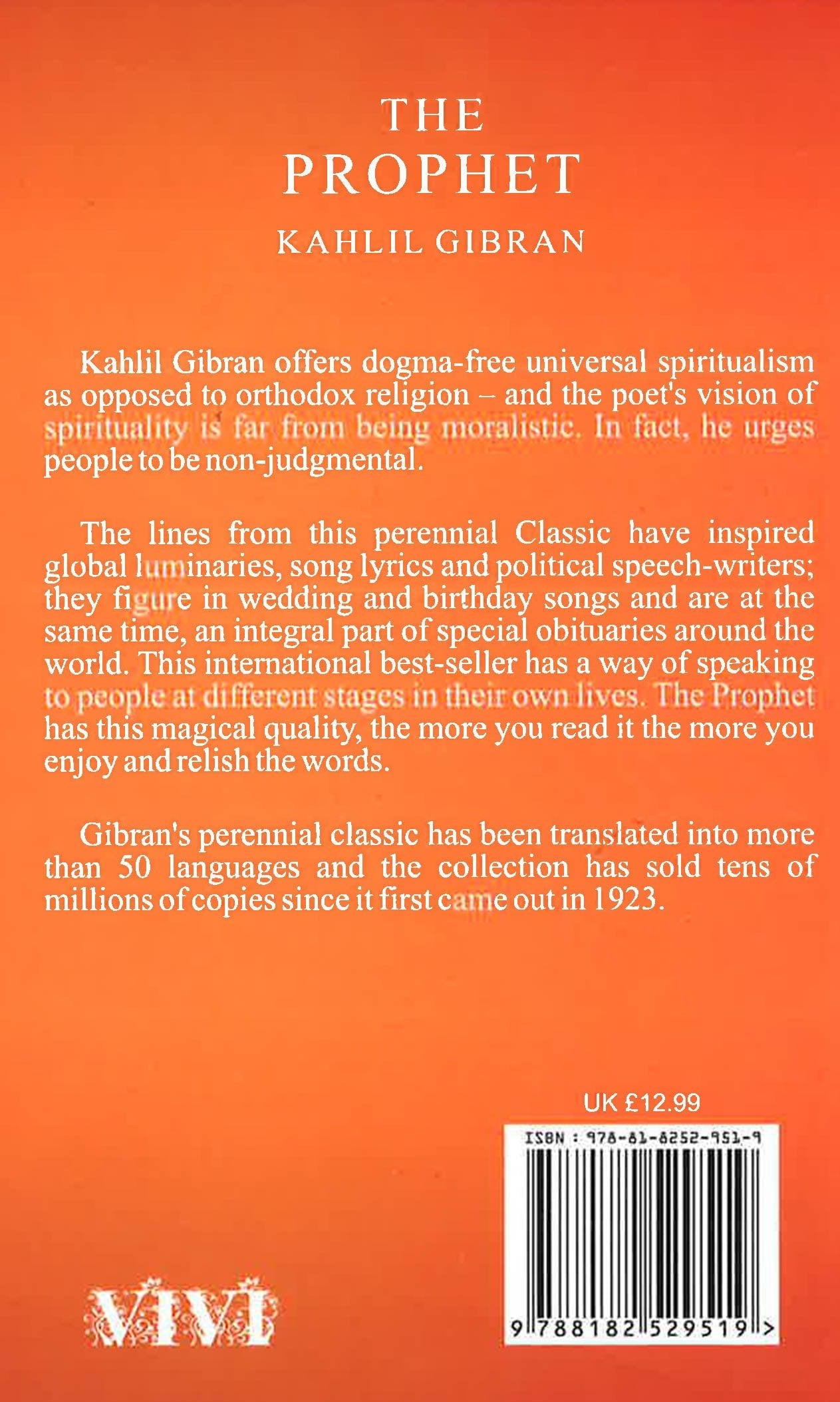 The prophet, Al Mustafa, has lived in the city of Orphalese for 12 years and is about to board a ship which will carry him home. He is stopped by a group of people, with whom he discusses topics such as life and the human condition. The book is divided into chapters dealing with love, marriage, children, giving, eating and drinking, work, joy and sorrow, houses, clothes, buying and selling, crime and punishment, laws, freedom, reason and passion, pain, self-knowledge, teaching, friendship, talking, time, good and evil, prayer, pleasure, beauty, religion, and death.