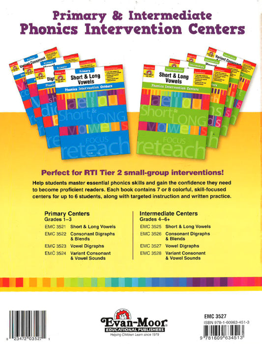 Each of the eight centers in this book contains: Six sets of a two-sided mat and corresponding task cards. Two reproducible activity pagesPractice It! and Read It!for written practice and assessment. Word cards presenting words with the targeted letter-sound pattern. Directions, answer key and student record forms. One teacher page providing explicit scripted instruction leading students through the steps of building phonemic awareness, oral blending, and visual blending of the targeted sound. One teacher page providing explicit scripted instruction for guiding students through the mat activities and Read It! and Write It! pages. The eight centers in this title cover: Long a Digraphs ai and ay, Long e Digraphs ea and ee, Long i Digraphs ie and igh, Long o , Digraphs oa and ow, Long u Digraphs ew and ue, The oo Digraph, The au and aw Digraphs, and Vowel Digraphs Review.