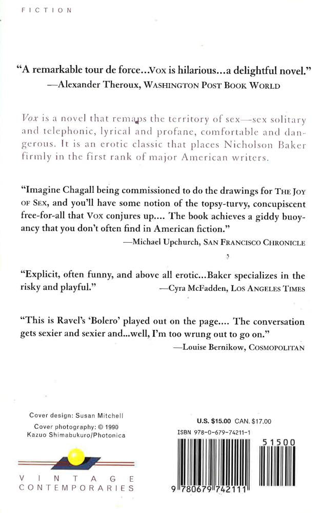Vox is a novel that remaps the territory of sex--sex solitary and telephonic, lyrical and profane, comfortable and dangerous. It is an erotic classic that places Nicholson Baker firmly in the first rank of major American writers.