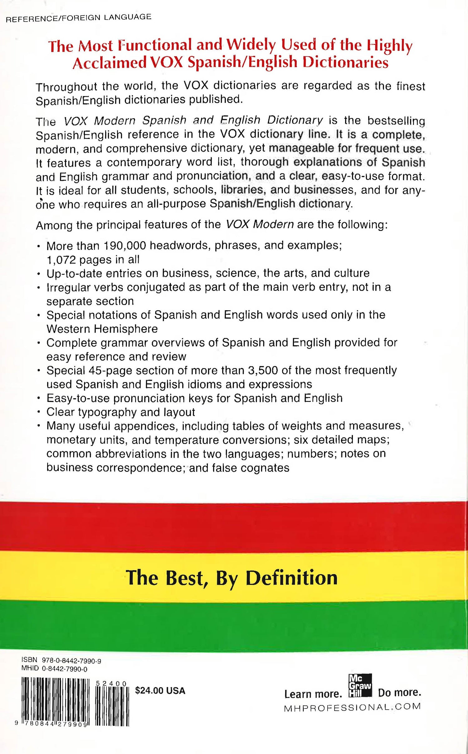 With more than 190,000 headwords, phrases, and examples, this all-purpose Spanish and English dictionary offers maximum content in a manageable format. Useful features include a section on Spanish and English idioms, verb conjugations, and grammar notes.