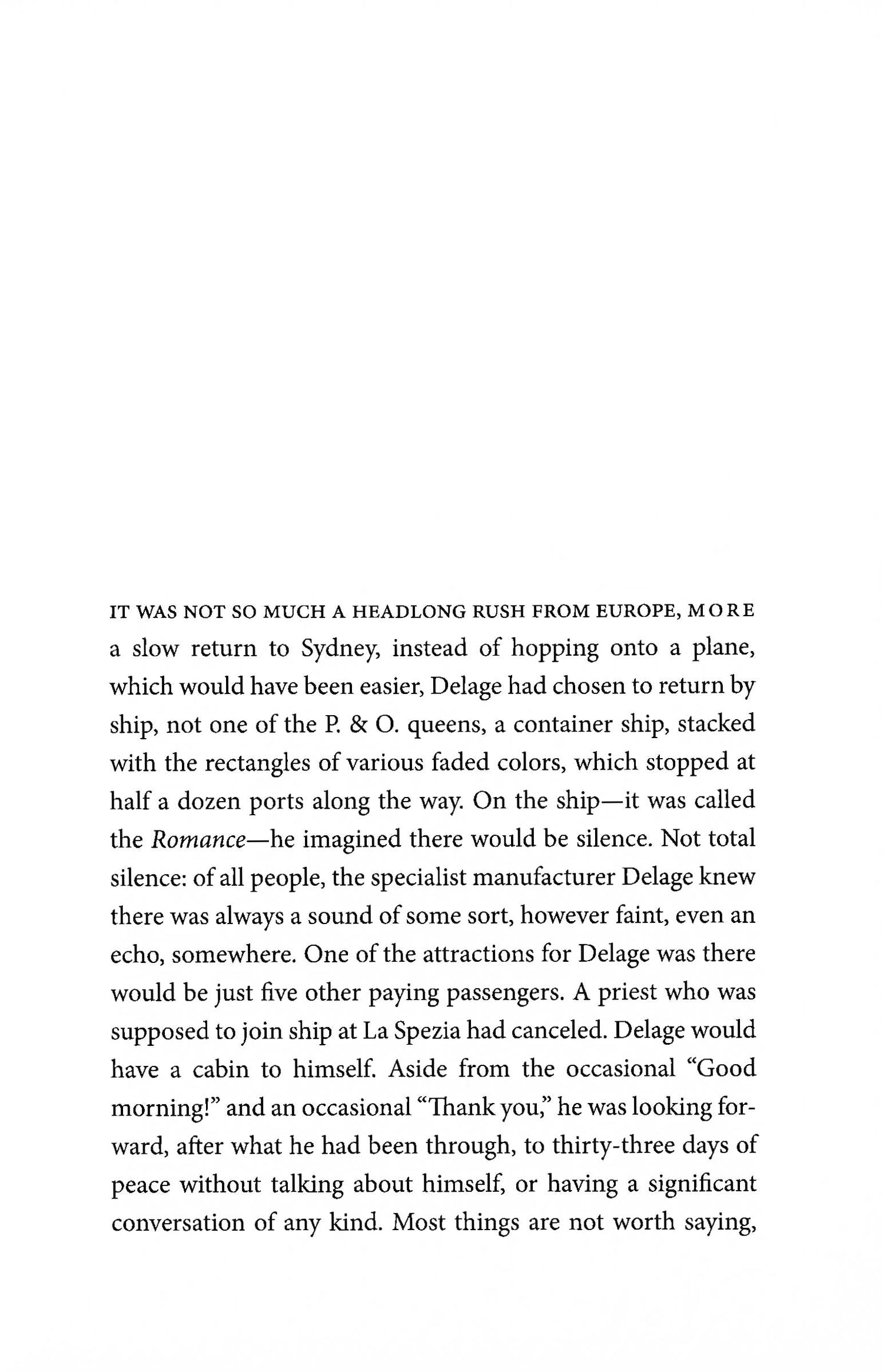 Now sailing home to Australia aboard the container ship Romance with his new bride, Amalia's daughter Elisabeth von Schalla, Delage and his story begin to come to light in a hypnotic sequence of memories, voices, and snatches of conversations.