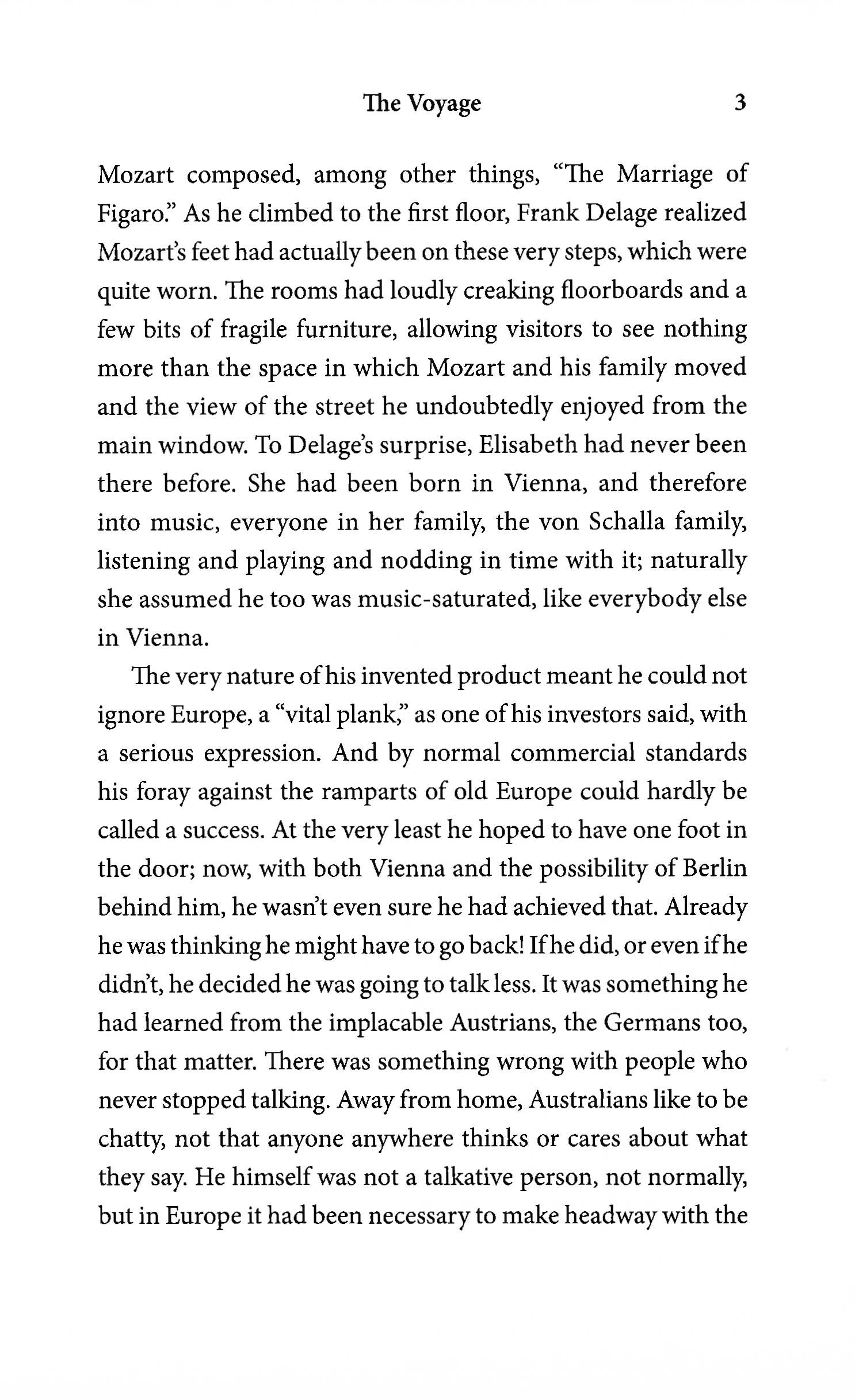 In The Voyage, Piano manufacturer and salesman Frank Delage travels to Vienna from Sydney, hoping to introduce a new design to replace the respected old pianos of Europe. He walks the great musical city, offering an impassioned defense of his piano's technical superiority to any who will hear it. When his ambitions are ignored by the city's staid musical elite, Delage's finds his situation suddenly transformed by a chance meeting with Amalia von Schalla, an elegant grande dame of Viennese society.