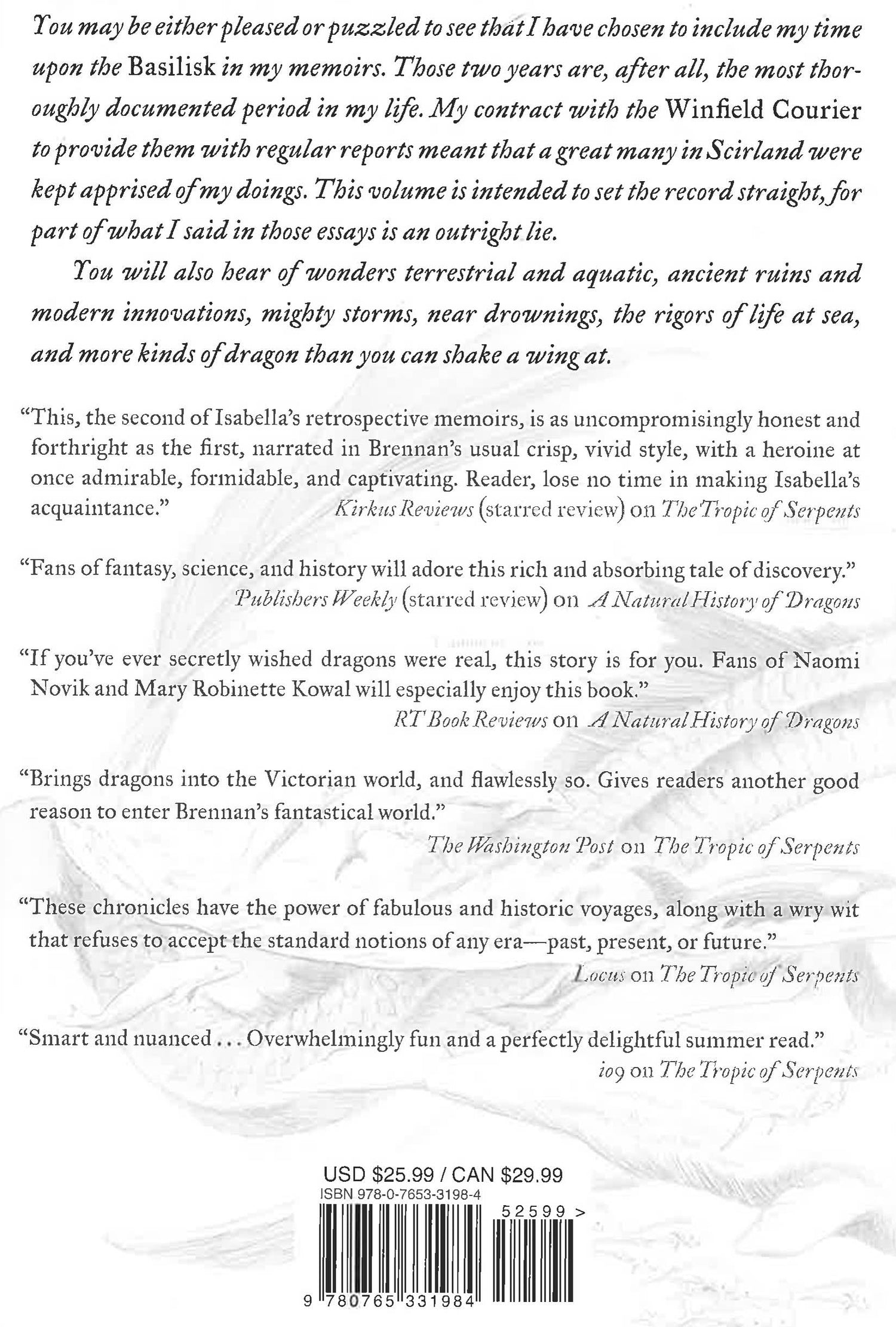 The thrilling adventure of Lady Trent continues in Marie Brennan's Voyage of the Basilisk . . . Devoted readers of Lady Trent's earlier memoirs, A Natural History of Dragons and The Tropic of Serpents, may believe themselves already acquainted with the particulars of her historic voyage aboard the Royal Survey Ship Basilisk, but the true story of that illuminating, harrowing, and scandalous journey has never been revealed - until now. Six years after her perilous exploits in Eriga, Isabella embarks on her most ambitious expedition yet: a two-year trip around the world to study all manner of dragons in every place they might be found. From feathered serpents sunning themselves in the ruins of a fallen civilization to the mighty sea serpents of the tropics, these creatures are a source of both endless fascination and frequent peril. Accompanying her is not only her young son, Jake, but a chivalrous foreign archaeologist whose interests converge with Isabella's in ways both professional and personal. Science is, of course, the primary objective of the voyage, but Isabella's life is rarely so simple. She must cope with storms, shipwrecks, intrigue, and warfare, even as she makes a discovery that offers a revolutionary new insight into the ancient history of dragons.