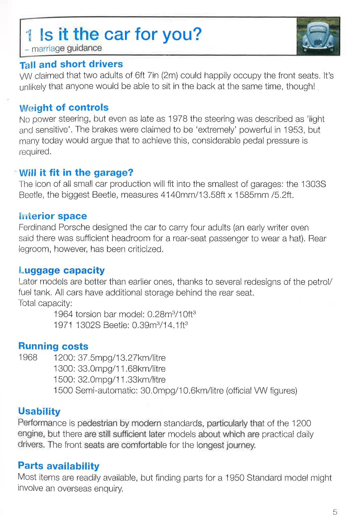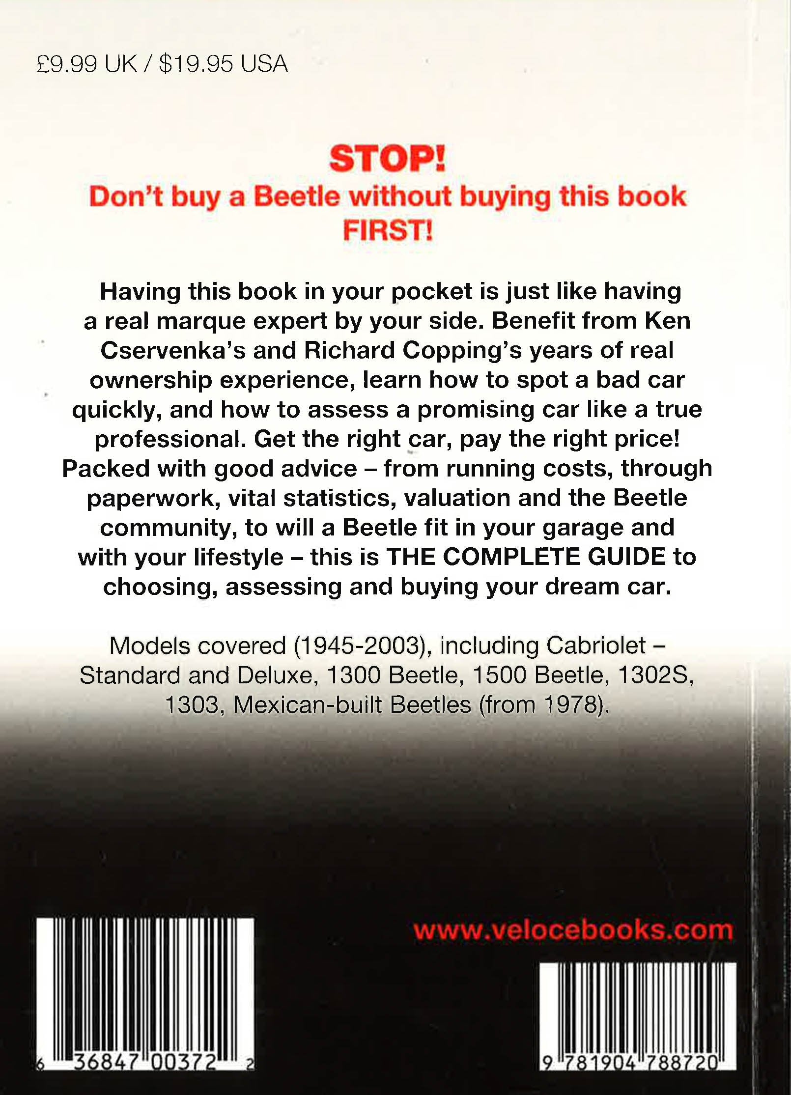 A small investment in this book could save you a fortune. With the aid of this book's step-by-step expert guidance, you will discover all you need to know about the car you want to buy. The unique point system will help you to place the car's value in relation to condition. Buying a classic VW Beetle is an important investment - don't buy one without this book's help. The authors, a recognised VW Beetle enthusiast and writer and a specialist photographer, cover all models from 1945 to 2003, including the Cabriolet, Standard and Deluxe and the final generation of Mexican Beetles.; Don't buy a car without this book!; Expert advice from a marque expert; Unique points scoring system to evaluate cars after inspection; Walk away or stay? - a quick initial evaluation of a car; How to check a car's authenticity; Which models are best?; Implications of restoration; Is it the right car for you?; Running costs; Don't buy a Beetle without this unique illustrated guide! Expert advice will help you find the best VW for your money.