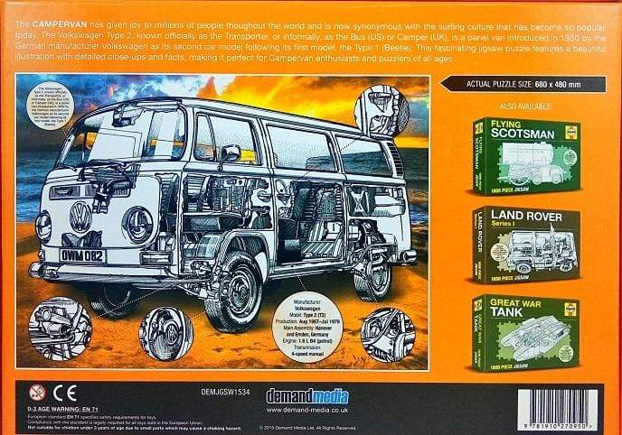 The Campervan has given joy to millions of people thoughout the world and is now synonymous with the surfing culture that has become so popular today. The Volkswagen Type 2, know officially as the Transporter, or informally, as the Bus (US) or Camper (UK), is panel van introduced in 1950 by the German manufacturer Volkswagen as its second car model following its first model, the Type 1 (Beetle). This fascinating jigsaw puzzle features a beautiful illustration with detailed close-ups and facts, making it perfect for Campervan enthusiasts and puzzlers of all ages.