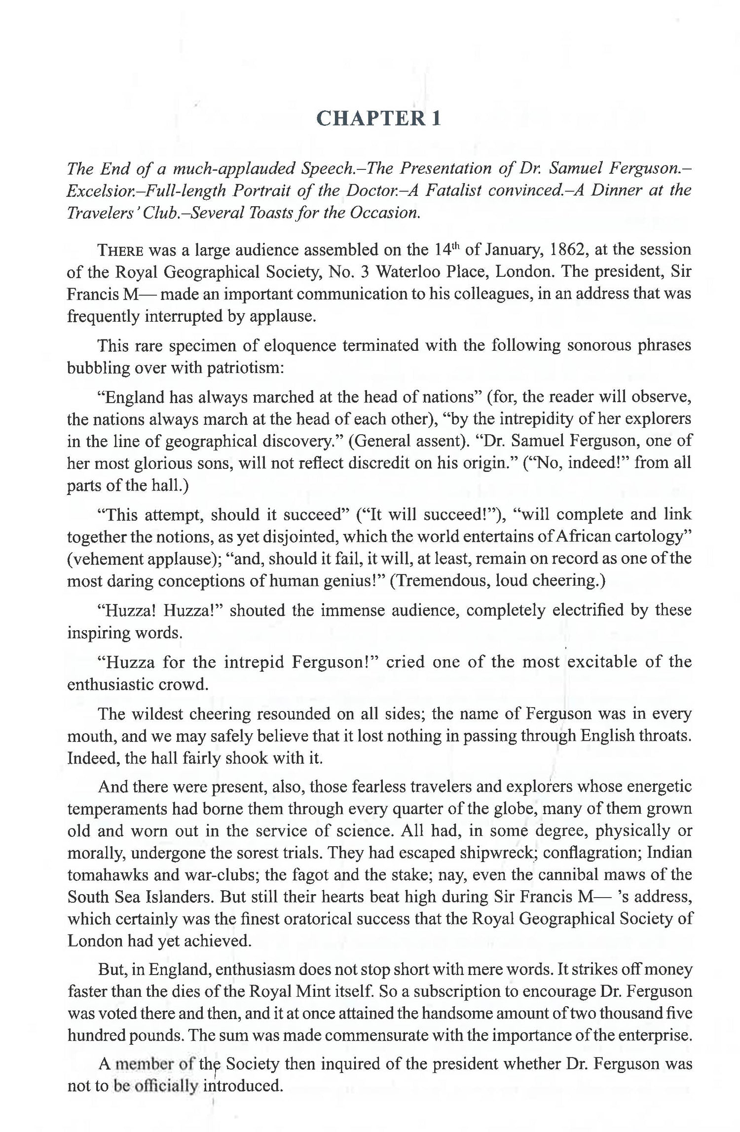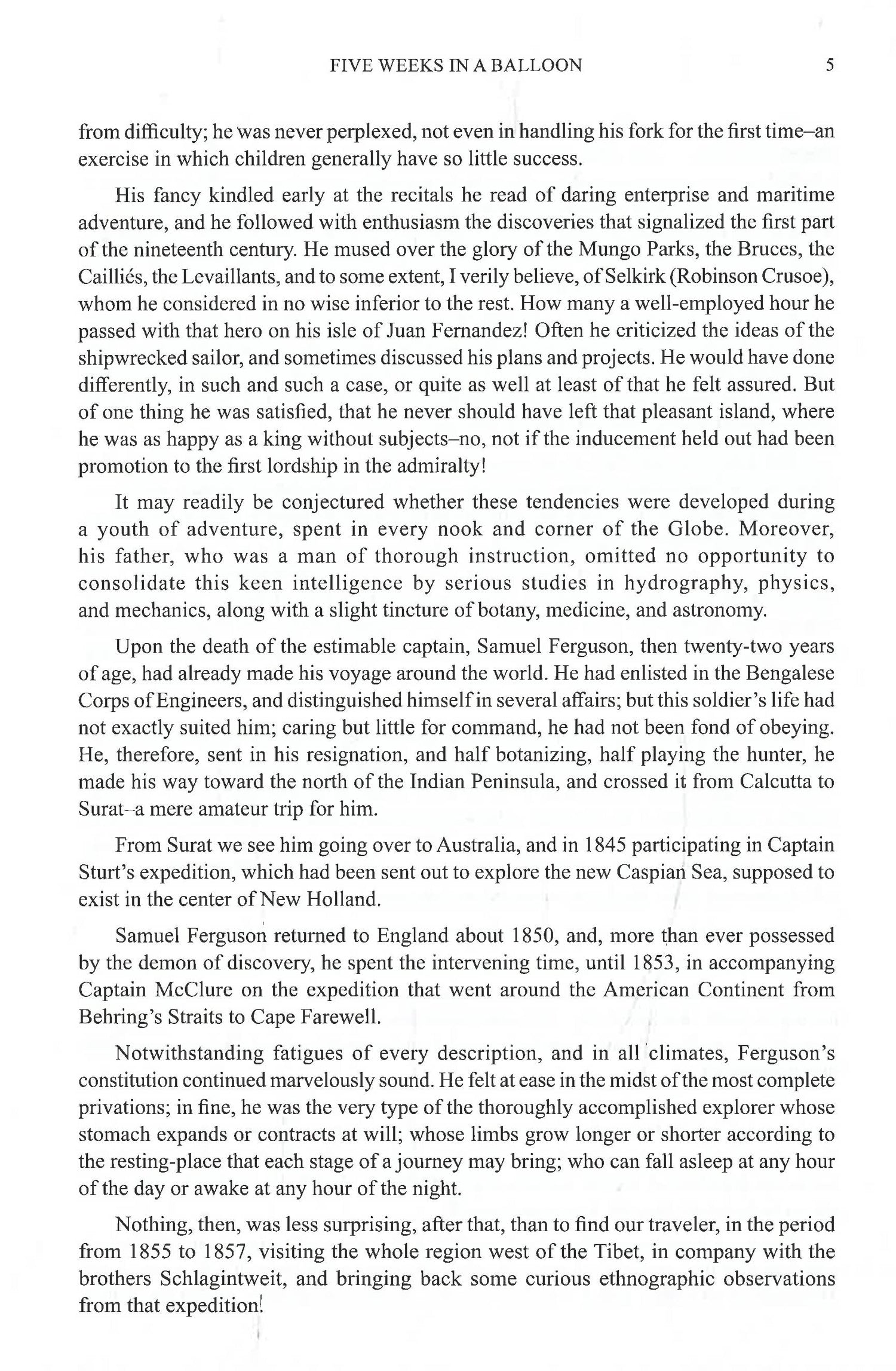 1) Five Weeks in a Balloon Five Weeks in a Balloon by Jules Verne describes a journey undertaken by three British gentlemen across the continent of Africa, from Zanzibar to the French settlement near the Senegal River. Written in 1863, it details the adventure that Dr. Ferguson embarks on with a friend and his servant, Joe, in a hot air balloon. Balancing scientific facts with historical fact, the adventurers observe the wild life, the flora, the hunting game spread across the region, the various tribes, the cannibals, play-act as gods, escape rampaging apes, save a missionary while also trying to find the origins of the Nile. The book showcases the effort of the western world, especially that of the Europeans, to understand and discover this impenetrable continent.