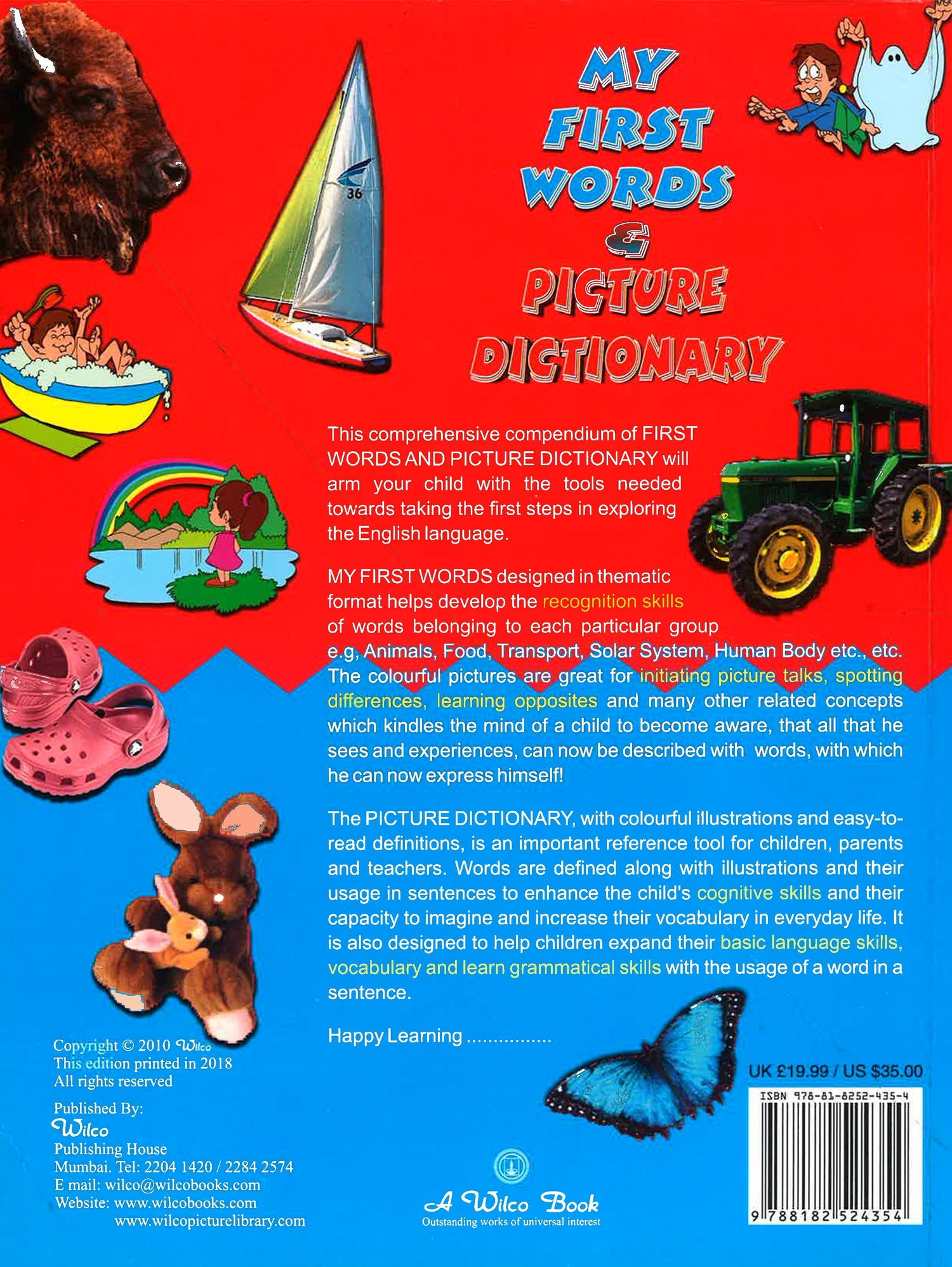 This comprehensive compendium of My First Words & Picture Dictionary, will arm your child with the tools needed towards taking the first steps in exploring the English language. My First Words, designed in thematic format helps develop the recognition skills of words belonging to each particular group e.g, Animals, Food, Transport, Solar System, Human Body etc. The colourful pictures are great for initiating picture talks, sporting differences, learning opposites & many other related concepts which kindles the mind of a child to become aware, that all that he sees & experiences, can now be described with words, with which he can now express himself. My First Words, The Picture Dictionary with colourful illustrations & easy to read definitions, is an important reference tool for children, parents & teachers. Words are defined along with illustrations & their usage in sentences to enhance the child's cognitive skills & their capacity to imagine & increase their vocabulary in everyday life. It is also designed to help children expand their basic language skills, vocabulary & learn grammatical skills with the usage of a word in a sentence. Happy Learning.