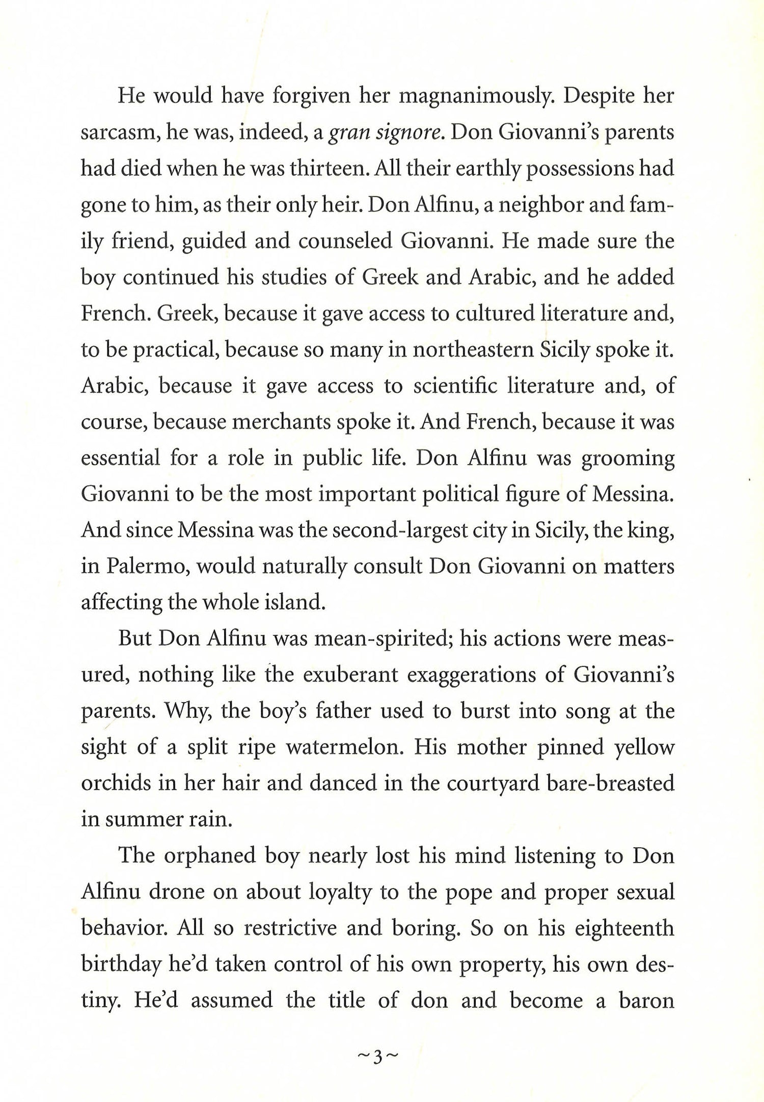 Don Giovanni was once the wealthiest and handsomest young man in Messina. Then a tidal wave changed everything. When a well-dressed stranger offers him a magical purse, he knows he shouldn’t take it. Only the devil would offer a deal like this, and only a fool would accept. Don Giovanni is no fool, but he is desperate. He takes the bet: he will not bathe for 3 years, 3 months, and 3 days. Beauty is a small price to pay for worldly wealth, isn’t it? Unless he loses the wager -- and with it his soul. Set against the stunning backdrop of ancient Sicily, Donna Jo Napoli’s new novel is a powerful tale about discovering what truly matters most.