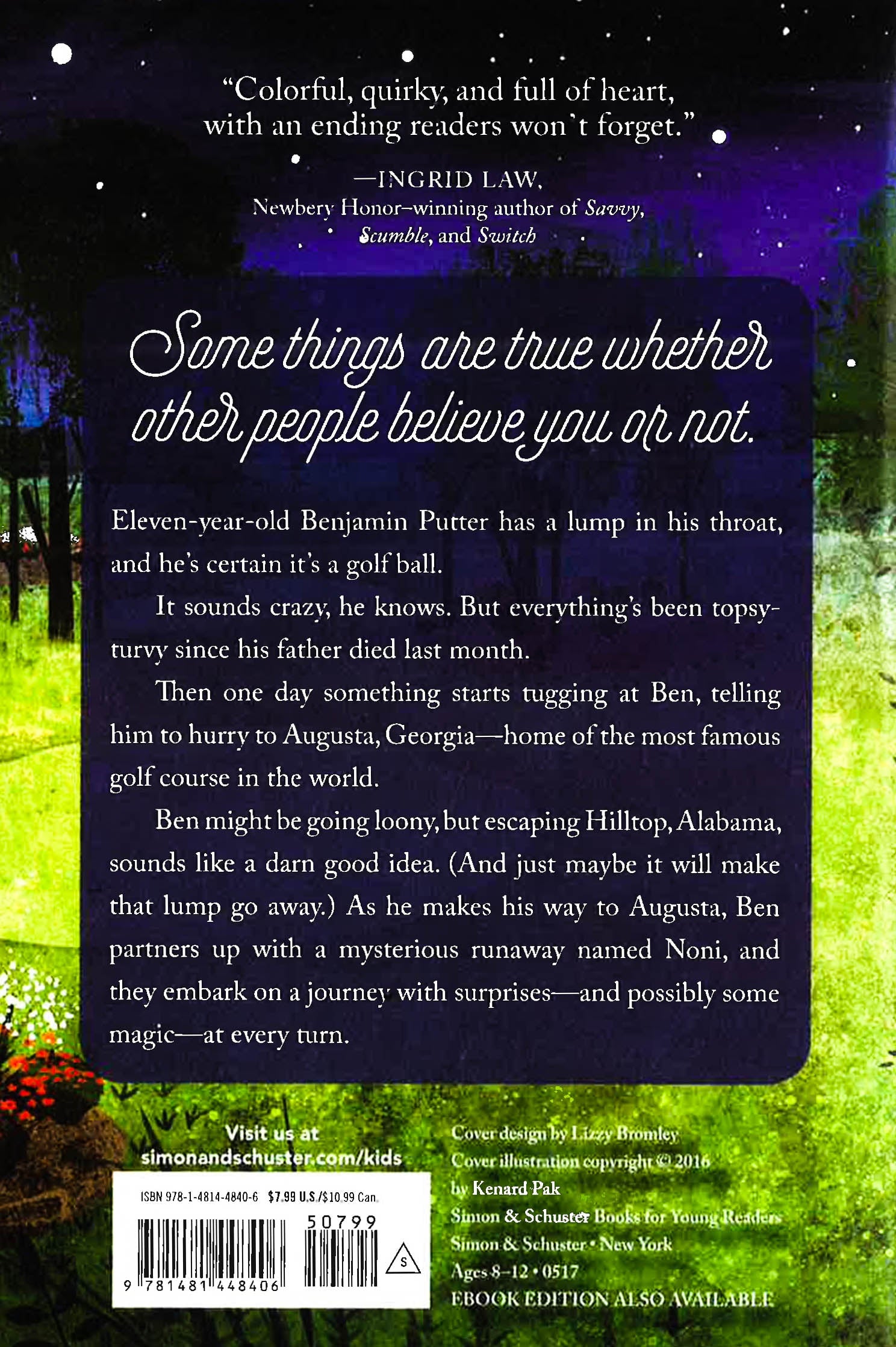 Eleven-year-old Benjamin Putter has a lump in his throat, and he’s certain it’s a golf ball. He knows it sounds crazy, but everything’s been topsy-turvy since his father died last month. And he doesn’t know how to fix it.Then, one day, something starts tugging at Ben, telling him to hurry to Augusta, Georgia - home of the most famous golf course in the world.Ben might be going a little crazy, but escaping Hilltop, Alabama, sounds like a darn good idea. (And just maybe it will make that lump go away.) As he makes his way to Augusta, Ben partners up with a mysterious runaway named Noni, and they embark on a journey full of strange and wonderful surprises - and possibly magic - at every turn.