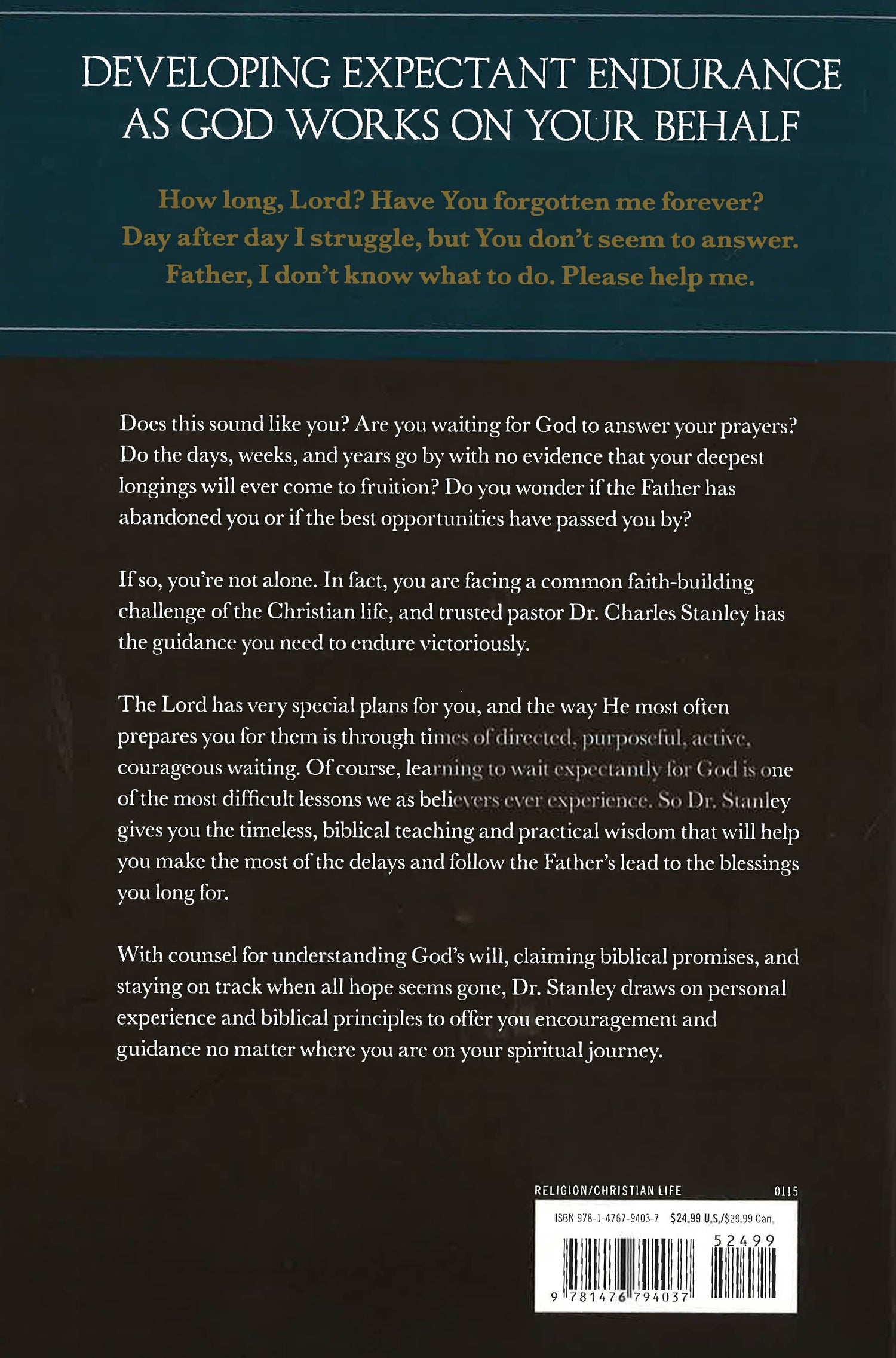 Trusted Pastor Dr. Charles Stanley offers words of comfort and patience to anyone waiting for answered prayers. Are you waiting for God to answer your prayers? Do the days, weeks and years go by without evidence that your deepest longings could ever come true? If so, you're not alone. In fact, you are facing a common faith-building challenge in the Christian life, and this book has the guidance you need to endure victoriously. God has very special plans for your life, and the way He most often prepares you for them is through times of directed, active, purposeful waiting. So through timeless, biblical teaching, Dr. Stanley gives you the practical wisdom you need to make the most of the delays and follow God's lead to the blessings you long for. With counsel for staying on track when the tunnel is getting dark, claiming God's promises, and finding purpose in the waiting, Dr. Stanley draws on personal experience and biblical principles to offer you encouragement and guidance no matter where you are in your spiritual journey.