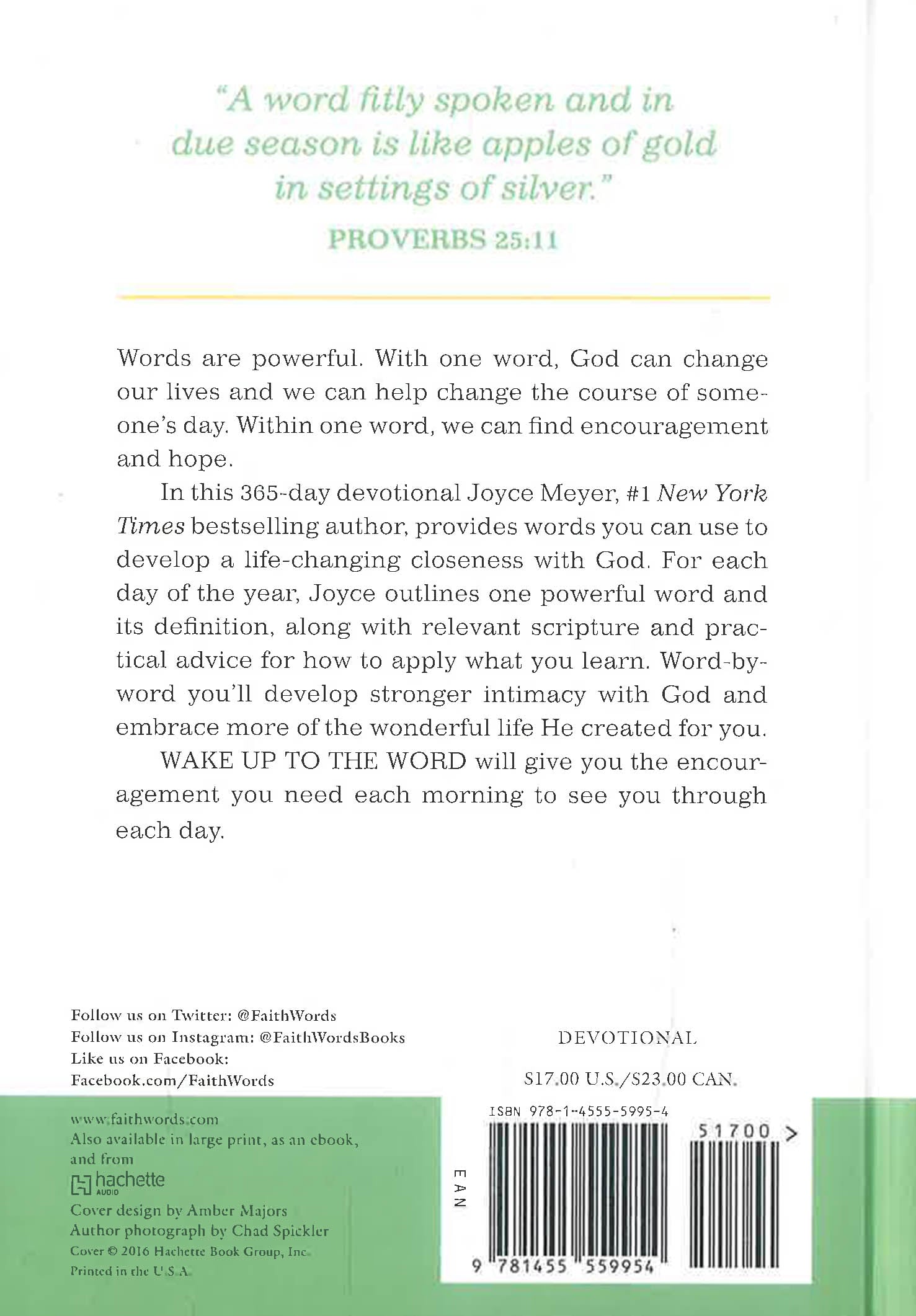 In her uplifting new devotional Joyce Meyer provides you with powerful words -- one for every day of the year. Each day's devotion offers a word to focus upon as a catalyst for positive change in your life. These words, along with relevant scripture and practical advice from Joyce, will help you achieve greater closeness with God, which unlocks the great things He has in store for your life.