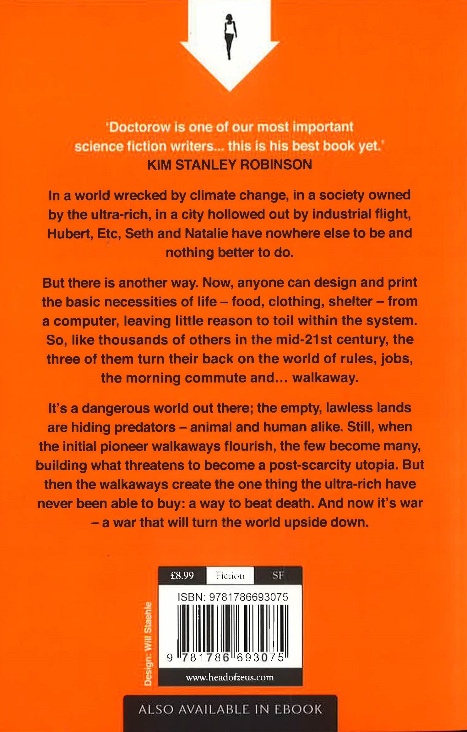 A multi-generational SF thriller about the momentous changes coming in the next hundred years: an epic tale of revolution, love, war, and the end of death. In a world wrecked by climate change, in a society owned by the ultra-rich, in a city hollowed out by industrial flight, Hubert, Etc, Seth and Natalie have nowhere else to be and nothing better to do. But there is another way. After all, now that anyone can design and print the basic necessities of life - food, clothing, shelter - from a computer, there is little reason to toil within the system. So, like thousands of others in the mid-21st century, the three of them turn their back on the world of rules, jobs, the morning commute and... walkaway. It's a dangerous world out there, the empty lands are lawless, hiding predators - animal and human alike. Still, when the initial pioneer walkaways flourish, the thousands become hundreds of thousands, building what threatens to become a post-scarcity utopia. But then the walkaways discover the one thing the ultra-rich have never been able to buy: how to beat death. And now it's war - a war that will turn the world upside down.