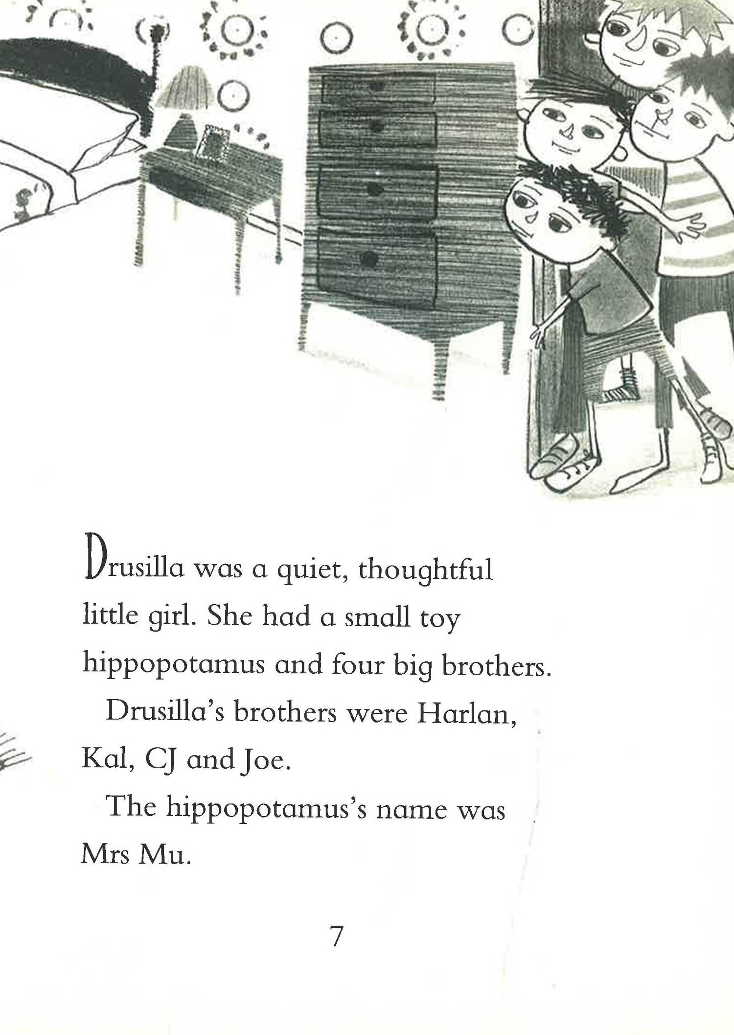 Move over, Sherlock Holmes!Drusilla is a quiet, thoughtful little girl who has a small toy hippopotamus and four older brothers. Her hippo (Mrs Mu) goes everywhere with Drusilla. Her brothers (Harlan, Kal, CJ and Joe) go nowhere with her. In fact, their sole aim seems to be to taunt their small sister and stop her from joining in with their games. Usually Drusilla can withstand any amount of teasing, but when Mrs Mu goes missing, she suspects foul play... This time Drusilla will have to call upon all her resourcefulness to win through.
