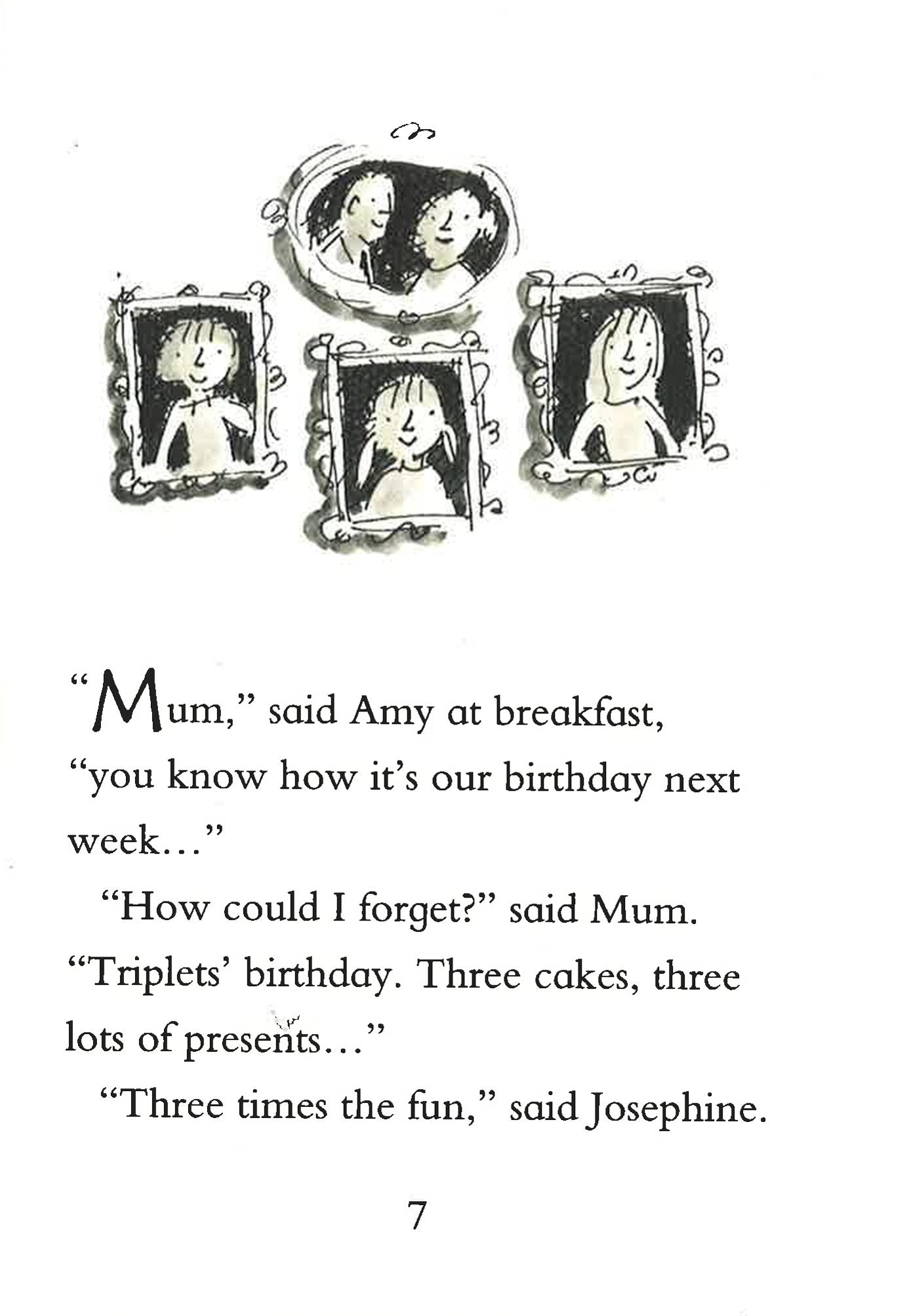 Birthday surprises are in store for the triplets in this enjoyable family story. The triplets' sixth birthday is coming up and the girls insist on buying individual presents for each other. They set out on a big shopping trip, but it's hard to choose - what will be just right for their sisters? Jo, Amy and Jess eventually find the perfect gift, but when the big day arrives, they end up playing with the things they gave rather than what they received! Perhaps they chose more for themselves than they realized...