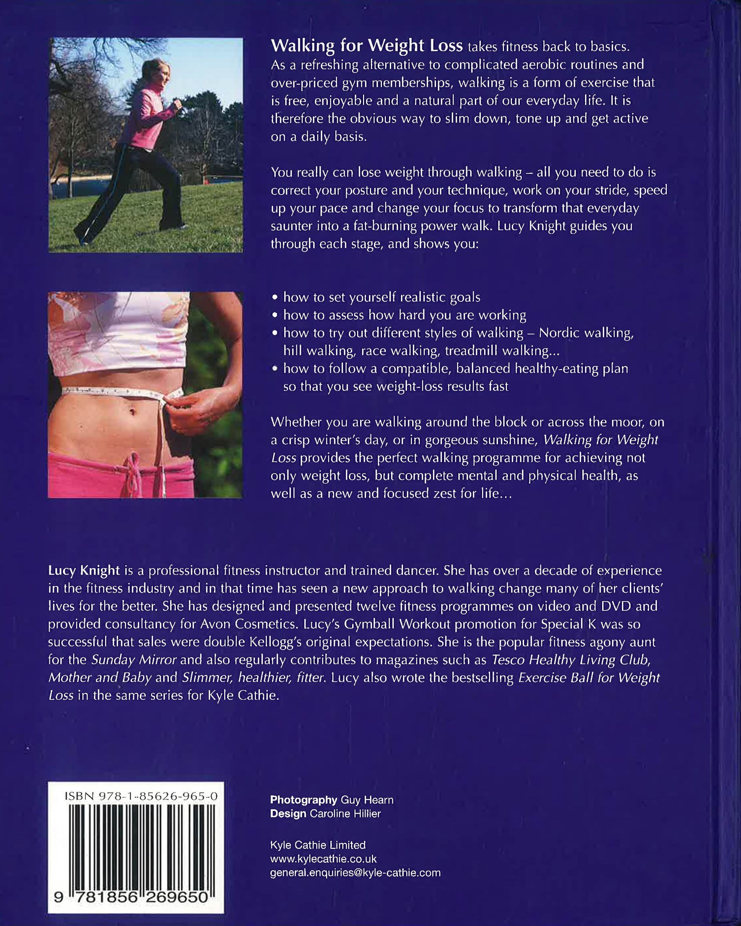 "Walking for Weight Loss" takes fitness back to basics. As a refreshing alternative to complex, choreographed dance routines and over-priced gym memberships, walking is a form of exercise that is free, enjoyable and a natural part of our everyday life. It is therefore the obvious way to slim down, tone up and get active on a daily basis. You really can lose weight through walking - all you need to do is correct your posture and your technique, work on your stride, speed up your pace and change your focus to transform that everyday saunter into a fat-burning power walk. Lucy Knight guides you through each stage, showing you how to set yourself realistic goals, how to assess how hard you are working and how to try out different styles of walking while also providing you with a compatible, balanced healthy eating plan so that you see results fast. Whether you are walking round the block or across the moor, on a crisp winters day, or in gorgeous sunshine, there is always a flexible option for you. It is the perfect and safest exercise for achieving not only weight loss, but complete mental and physical health, as well as a new and focused zest for life..