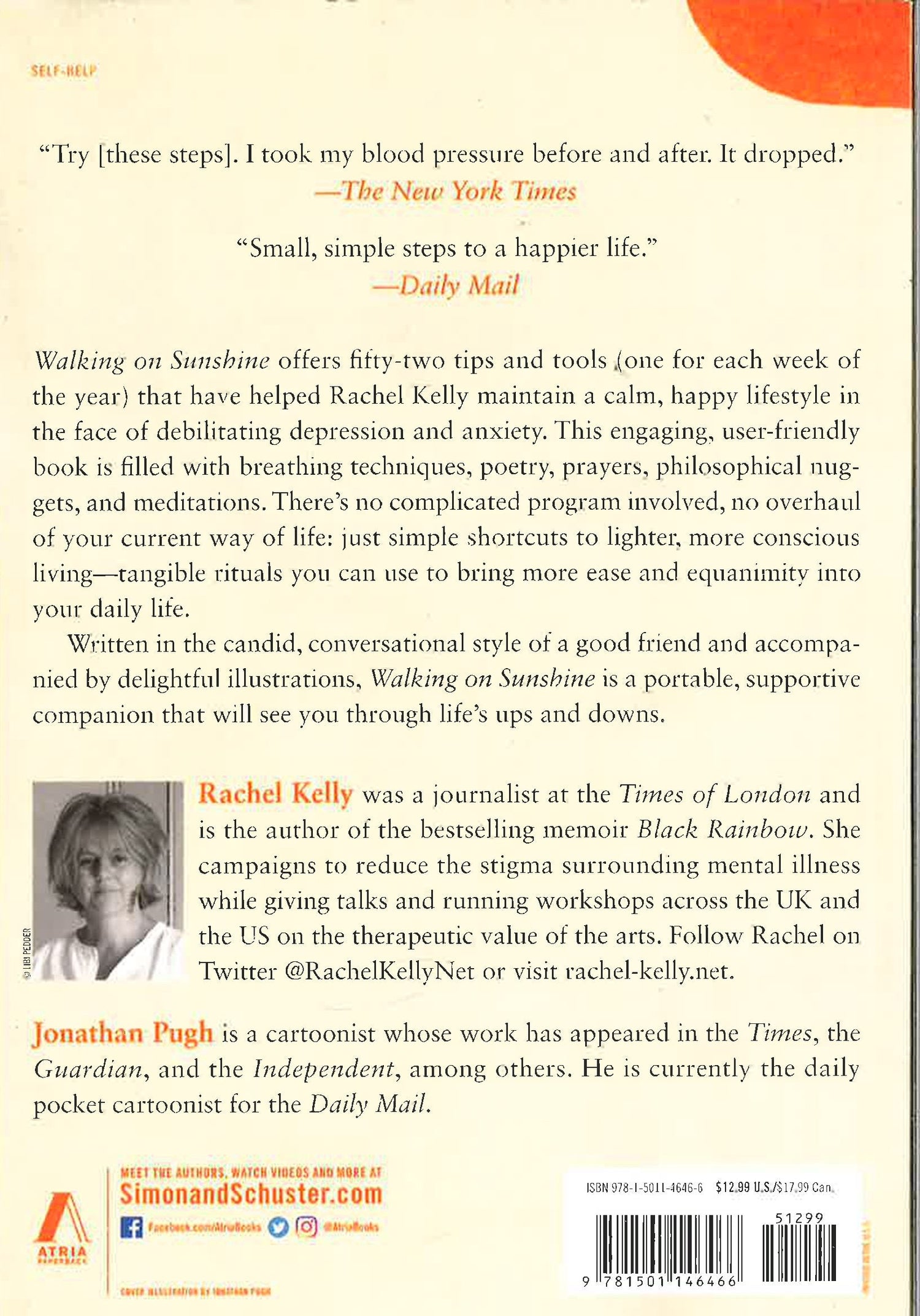 An accessible and clear-eyed handbook that offers fundamental tips, tools, and sanity-saving ideas to guide you through the seasons and help you better manage the mood-altering pressures of everyday life--"Try it. I took my blood pressure before and after. It dropped" (The New York Times). In the form of weekly journal entries over the course of a year, bestselling author, journalist, and mental health activist Rachel Kelly shares the fifty-two strategies that have helped her cope with depression and anxiety and maintain a calm, happy lifestyle. Walking on Sunshine requires no complicated program or an overhaul of your current way of life. These are simple shortcuts to lighter, more conscious living--tangible rituals you can use to care for your body and mind. In the pages of this engaging book, you'll find breathing techniques, poetry, prayer, philosophical nuggets, and meditations, all of them gentle suggestions designed to bring more ease and equanimity into your daily life. Written in the candid, conversational style of a good friend and accompanied by delightful cartoon illustrations, Walking on Sunshine is a constant, supportive companion that will see you through your ups and downs.