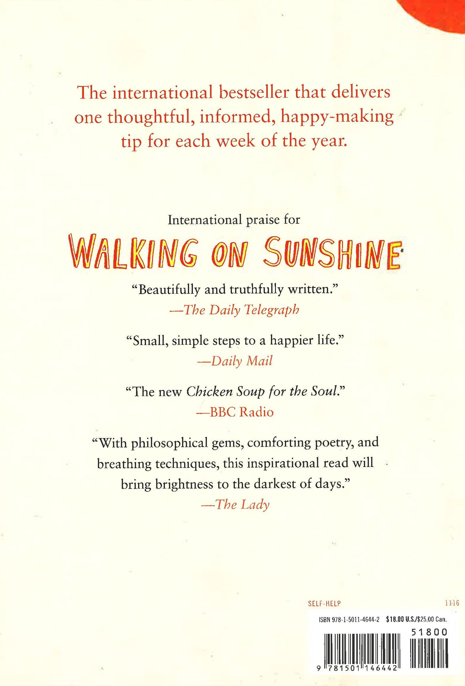 A compact, accessible, life-changing book, internationally bestselling Walking on Sunshine offers fifty-two tips and tools (one for each week of the year) to increase your happiness year-round and help you manage the mood-altering pressures of everyday life. In the form of weekly journal entries over the course of a year, journalist and mental health activist Rachel Kelly shares the fifty-two strategies that have helped her cope with depression and anxiety and maintain a calm, happy lifestyle. There's no complicated program involved, no overhaul of your current way of life: just simple shortcuts to lighter, more conscious living--tangible rituals you can use to care for your body and mind. In the pages of this engaging, user-friendly book, you'll find breathing techniques, poetry, prayer, philosophical nuggets, and meditations, all of them lovely, gentle suggestions designed to bring more ease and equanimity into your daily life. Whether you're going through a particularly emotional time or you're just trying to figure out how to achieve balance and moderate your reactions to conflict, there's something for everyone in this encouraging, comforting book. Written in the candid, conversational style of a good friend and accompanied by delightful cartoon illustrations, Walking on Sunshine is a portable, supportive companion that will see you through your ups and downs. *This book may have remainder mark*
