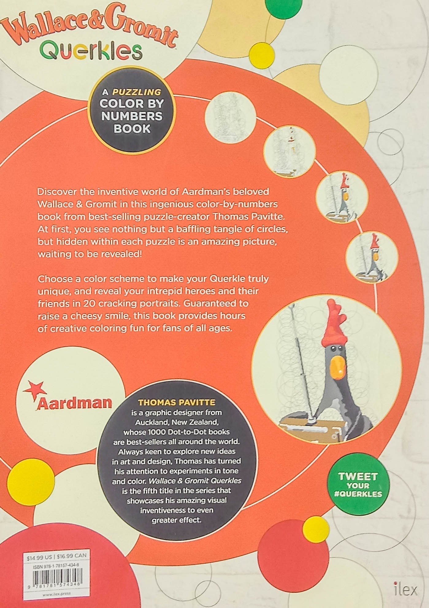 Color in the mysterious circles, solve the puzzle and reveal the 20 extraordinary portraits of Wallace, Gromit, Shaun the Sheep and all their friends! Thomas Pavitte's amazing Querkles are an exciting twist on the classic color-by-number images that we loved as children, and have sold hundreds of thousands of copies worldwide. At first, you see nothing but a ba ing tangle of circles, but hidden within each puzzle is an amazing picture, waiting to be revealed! Suggested color schemes for each Querkle ensure you will create a truly sensational image. Featuring the beloved characters of Aardman's Oscar-winning Wallace & Gromit movies, this book provides hours of creative coloring fun for fans of all ages. Choose a dramatic color scheme to make your Querkle truly unique, discover what's hidden in each puzzle, and create a striking portrait that you can easily remove and display.