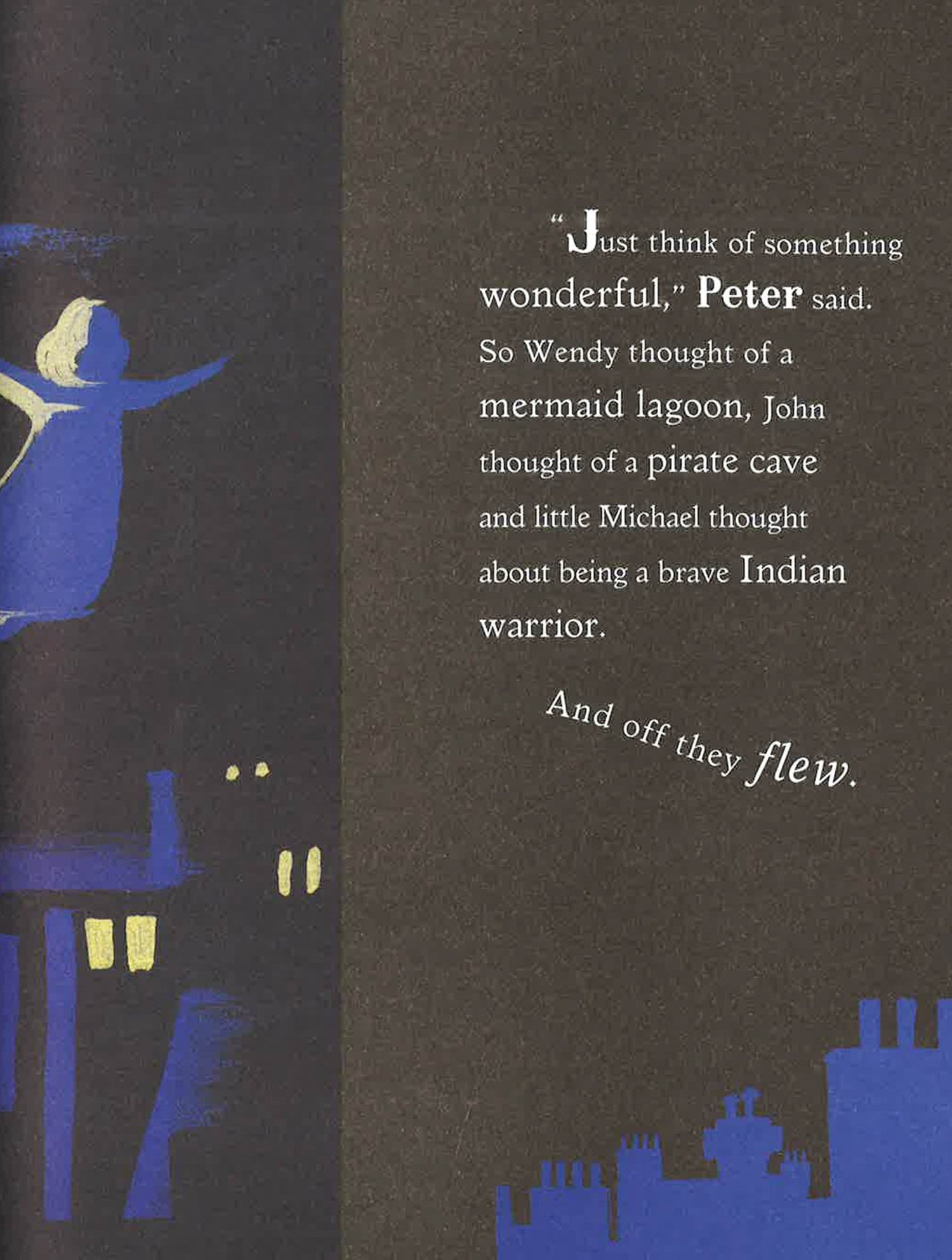 So Wendy thought of a mermaid lagoon, John thought of a pirate cave and little Michael thought about being a brave Indian warrior. And off they flew.
