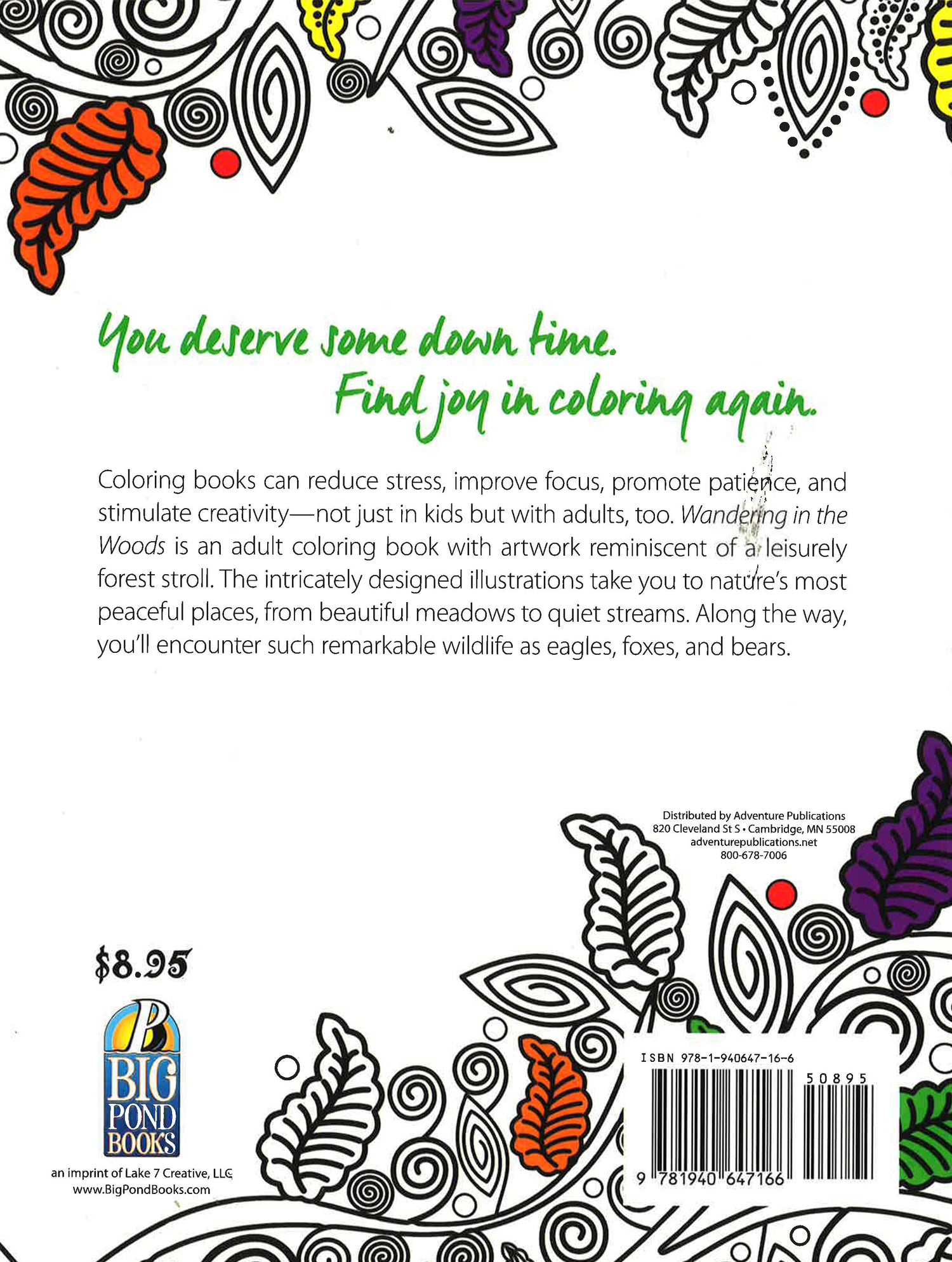 Coloring books can reduce stress, improve focus, promote patience, and stimulate creativity - not just in kids but with adult coloring books, too. Wandering in the Woods is a child and adult coloring book with artwork reminiscent of a leisurely forest stroll. The intricately designed illustrations take you to nature's most peaceful places, from beautiful meadows to quiet streams. Along the way, you'll encounter such remarkable wildlife as eagles, foxes, and bears. You deserve some down time. Find joy in coloring again.