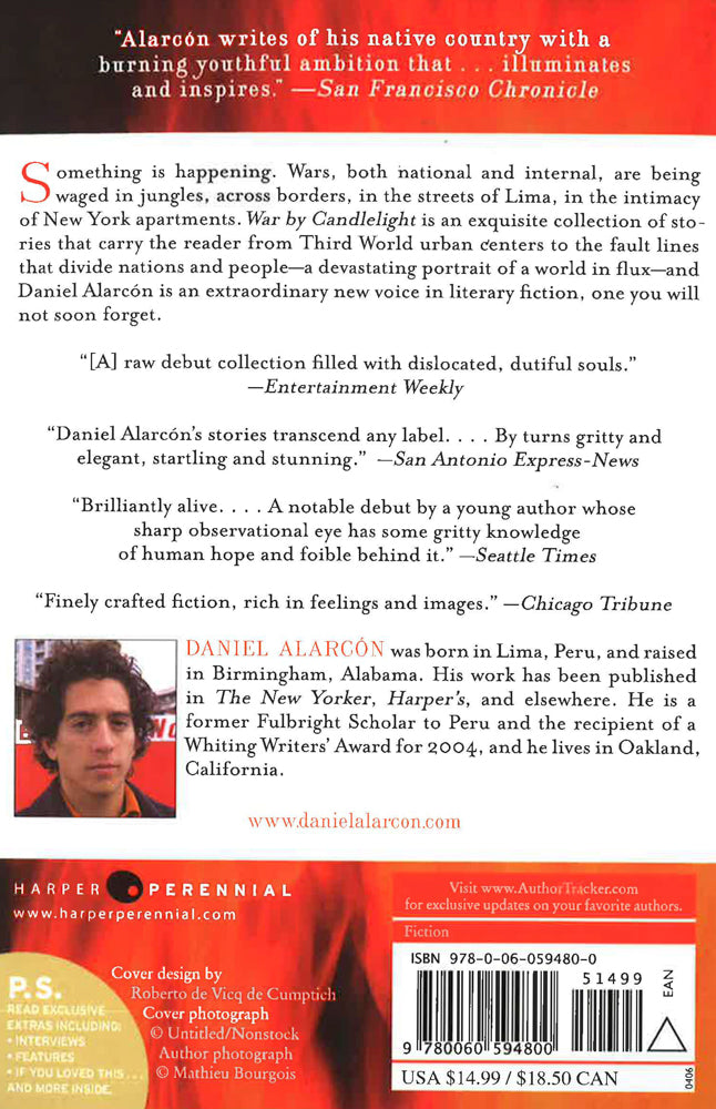 In this exquisite story collection, Daniel Alarcón moves from Third World urban centers to the fault lines that divide nations and people to illuminate wars, both national and internal, waged in jungles, across the borders, in the streets of Lima, and in the intimacy of New York apartments. He tells of lives at the margins: an unrepentant terrorist remembers where it all began, a would-be emigrant contemplates the ramifications of leaving and never coming back, a reporter turns in his pad and pencil for the inglorious costume of a street clown. War by Candlelight is a devastating portrait of a world in flux from an extraordinary new voice in literary fiction, one you will not soon forget.