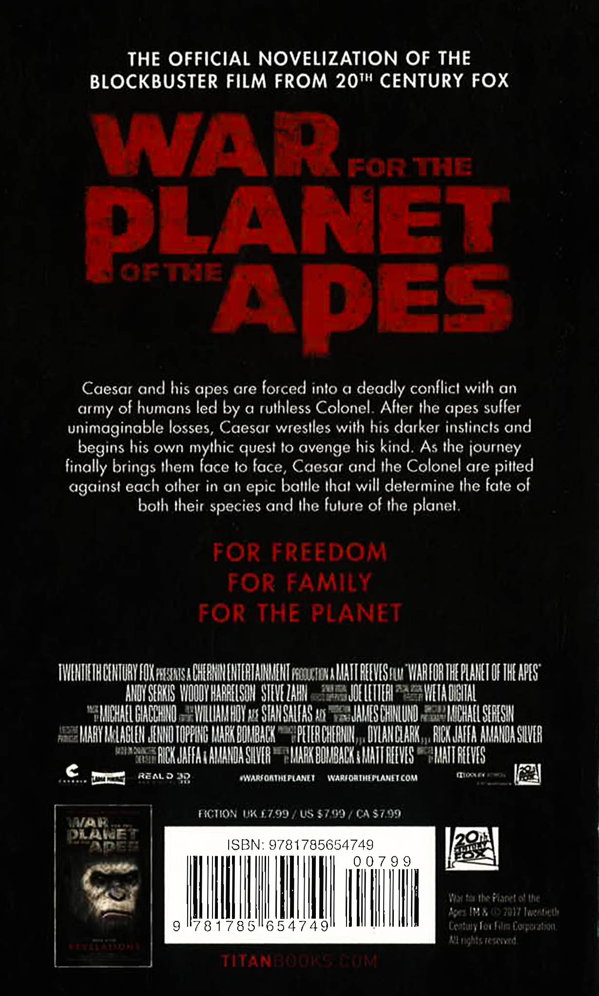In War for the Planet of the Apes, the third chapter of the critically acclaimed blockbuster franchise, Caesar and his apes are forced into a deadly conflict with an army of humans led by a ruthless Colonel. After the apes suffer unimaginable losses, Caesar wrestles with his darker instincts and begins his own mythic quest to avenge his kind. As the journey finally brings them face to face, Caesar and the Colonel are pitted against each other in an epic battle that will determine the fate of both their species and the future of the planet.