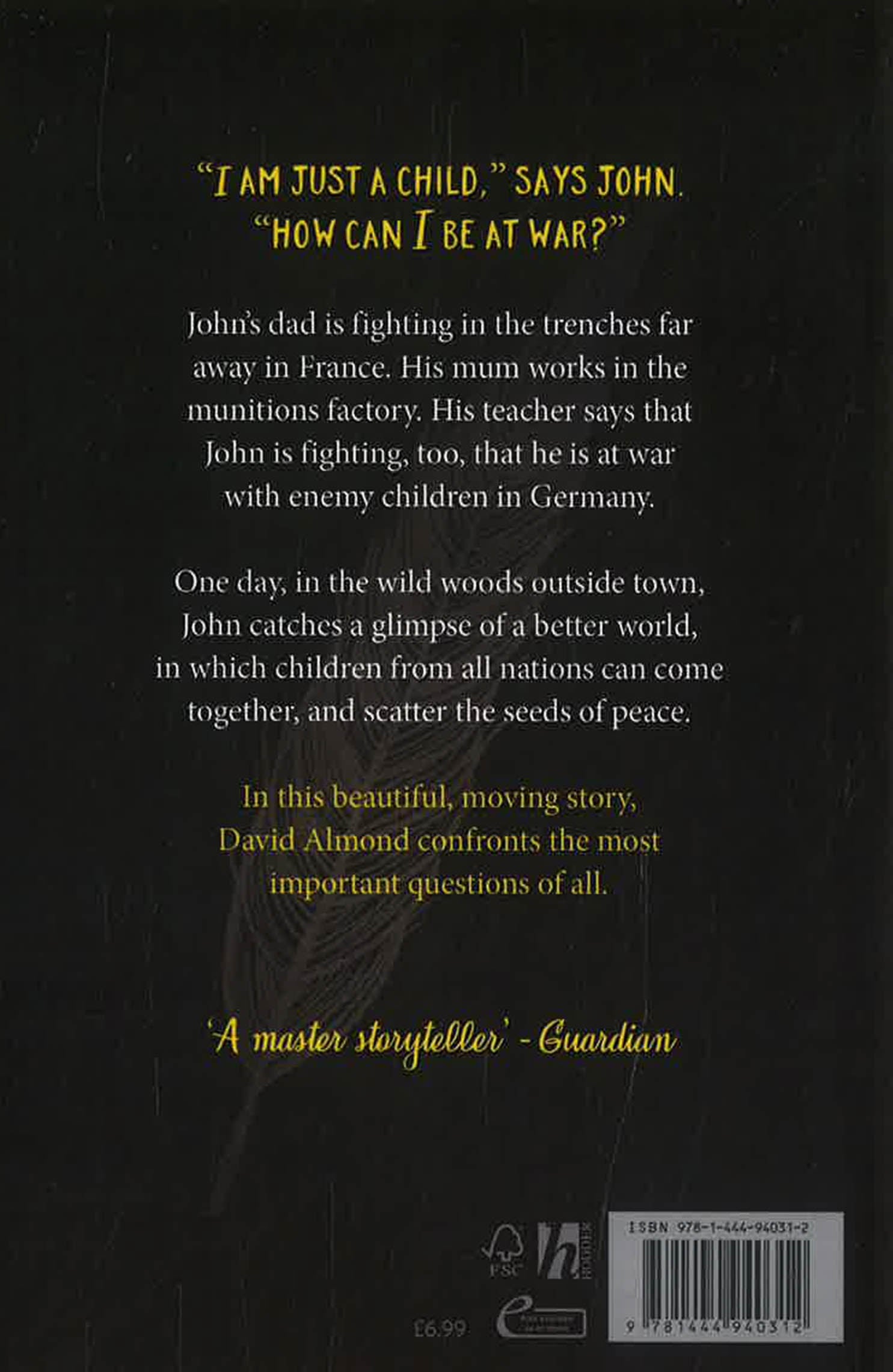 From the bestselling, award-winning author of SKELLIG comes a vivid and moving story, beautifully illustrated, which commemorates the hundred-year anniversary of the end of the First World War. "I am just a child," says John. "How can I be at war?"It's 1918, and war is everywhere. John's dad is fighting in the trenches far away in France. His mum works in the munitions factory just along the road. His teacher says that John is fighting, too, that he is at war with enemy children in Germany. One day, in the wild woods outside town, John has an impossible moment: a meeting with a German boy named Jan. John catches a glimpse of a better world, in which children like Jan and himself can come together, and scatter the seeds of peace. Gorgeously illustrated by David Litchfield, this is a book to treasure.
