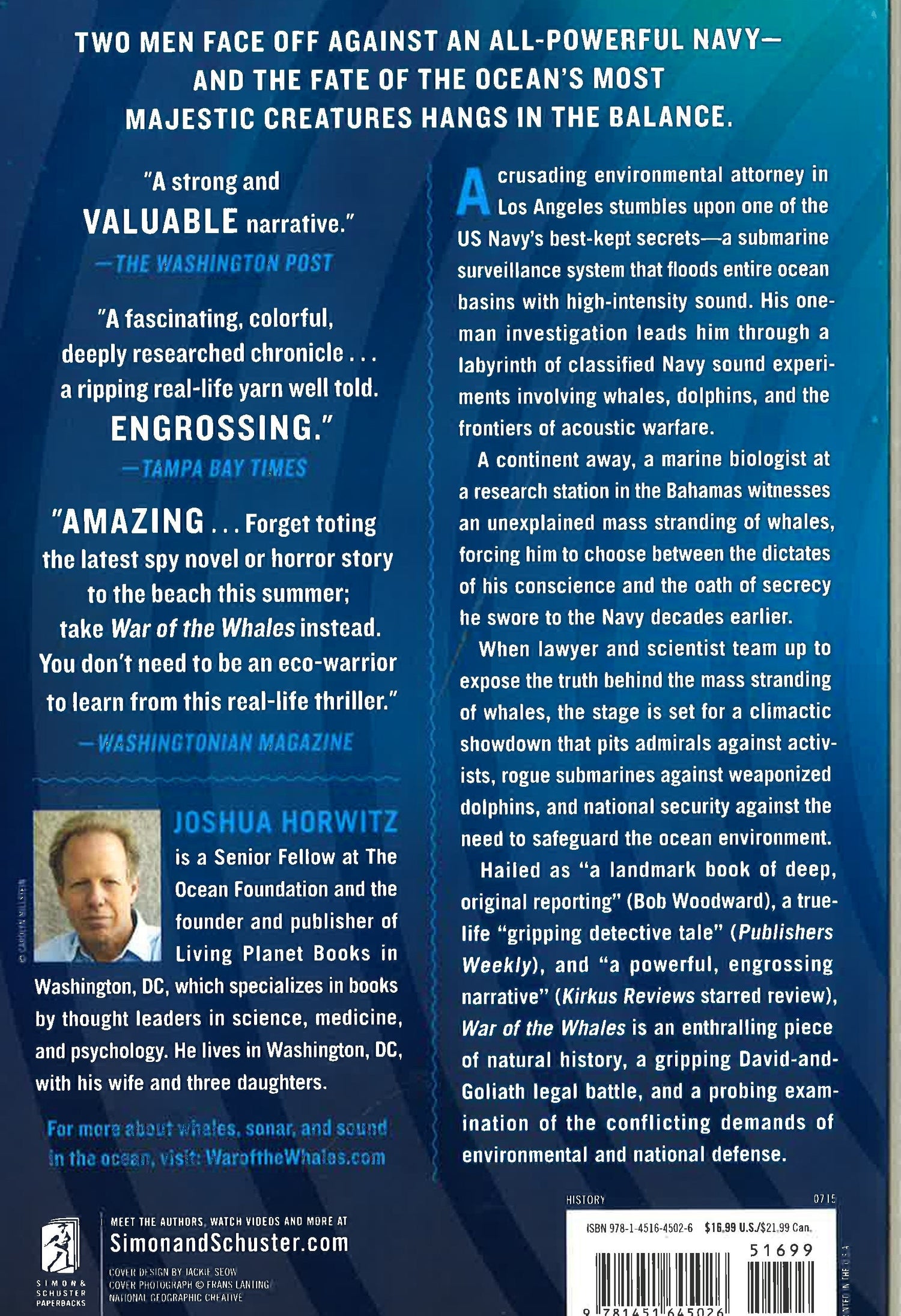 Winner of the 2015 PEN/E.O. Wilson Literary Science Writing Award: "Horwitz's dogged reporting...combined with crisp, cinematic writing, produces a powerful narrative.... He has written a book that is instructive and passionate and deserving a wide audience" (PEN Award Citation). Six years in the making, War of the Whales is the "gripping detective tale" (Publishers Weekly) of a crusading attorney, Joel Reynolds, who stumbles on one of the US Navy's best-kept secrets: a submarine detection system that floods entire ocean basins with high-intensity sound - and drives whales onto beaches. As Joel Reynolds launches a legal fight to expose and challenge the Navy program, marine biologist Ken Balcomb witnesses a mysterious mass stranding of whales near his research station in the Bahamas. Investigating this calamity, Balcomb is forced to choose between his conscience and an oath of secrecy he swore to the Navy in his youth. "War of the Whales reads like the best investigative journalism, with cinematic scenes of strandings and dramatic David-and-Goliath courtroom dramas as activists diligently hold the Navy accountable" (The Huffington Post). When Balcomb and Reynolds team up to expose the truth behind an epidemic of mass strandings, the stage is set for an epic battle that pits admirals against activists, rogue submarines against weaponized dolphins, and national security against the need to safeguard the ocean environment. "Strong and valuable" (The Washington Post), "brilliantly told" (Bob Woodward), author Joshua Horwitz combines the best of legal drama, natural history, and military intrigue to "raise serious questions about the unchecked use of secrecy by the military to advance its institutional power" (Kirkus Reviews, starred review).