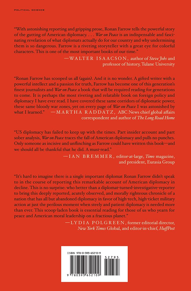 US foreign policy is undergoing a dire transformation, forever changing America's place in the world. Institutions of diplomacy and development are bleeding out after deep budget cuts; the diplomats who make America's deals and protect its citizens around the world are walking out in droves. Offices across the State Department sit empty, while abroad the military-industrial complex has assumed the work once undertaken by peacemakers. We're becoming a nation that shoots first and asks questions later. In an astonishing journey from the corridors of power in Washington, DC, to some of the most remote and dangerous places on earth-Afghanistan, Somalia, and North Korea among them-acclaimed investigative journalist Ronan Farrow illuminates one of the most consequential and poorly understood changes in American history. His firsthand experience as a former State Department official affords a personal look at some of the last standard bearers of traditional statecraft, including Richard Holbrooke, who made peace in Bosnia and died while trying to do so in Afghanistan. Drawing on newly unearthed documents, and richly informed by rare interviews with warlords, whistle-blowers, and policymakers-including every living former secretary of state from Henry Kissinger to Hillary Clinton to Rex Tillerson-War on Peace makes a powerful case for an endangered profession. Diplomacy, Farrow argues, has declined after decades of political cowardice, shortsightedness, and outright malice-but it may just offer America a way out of a world at war.