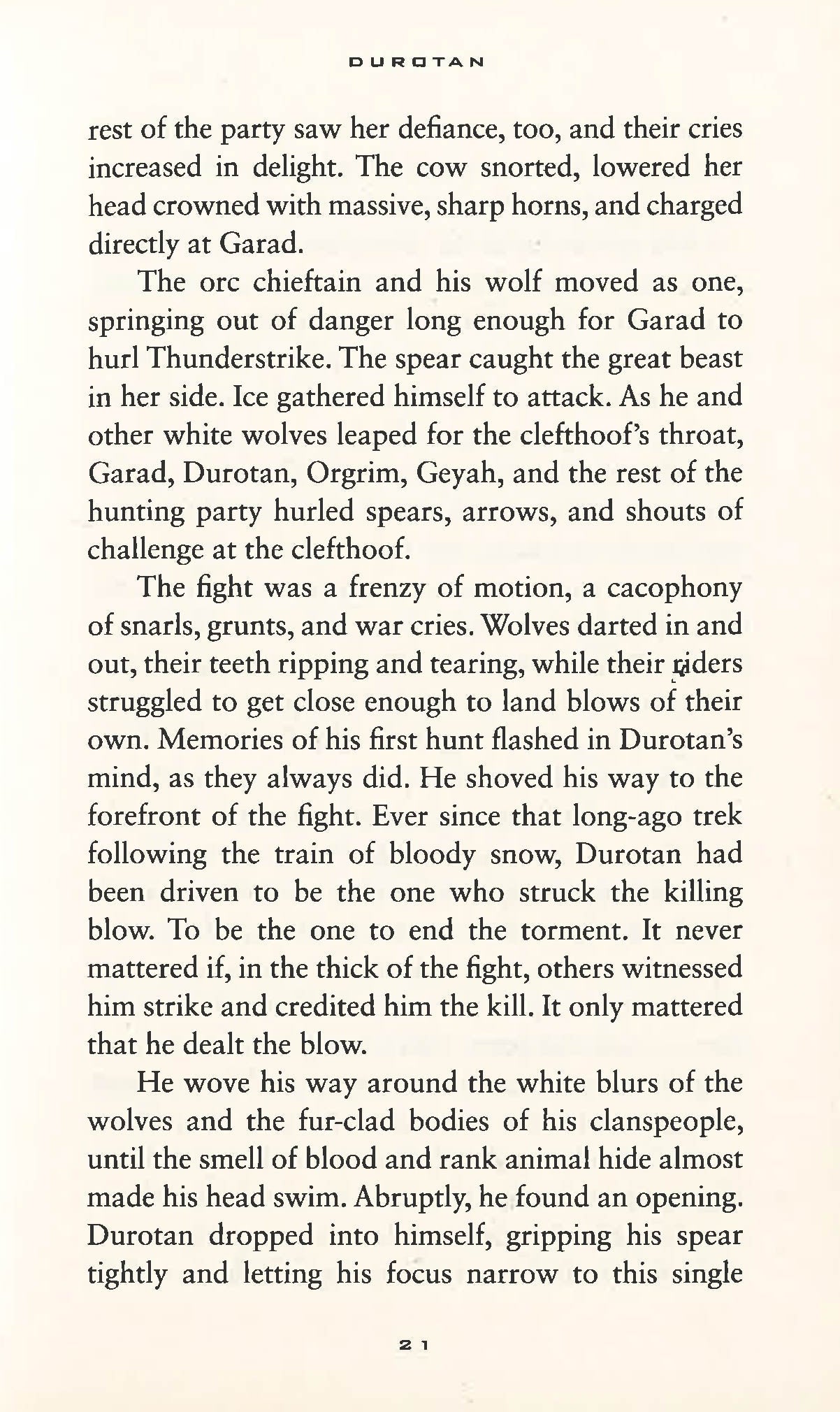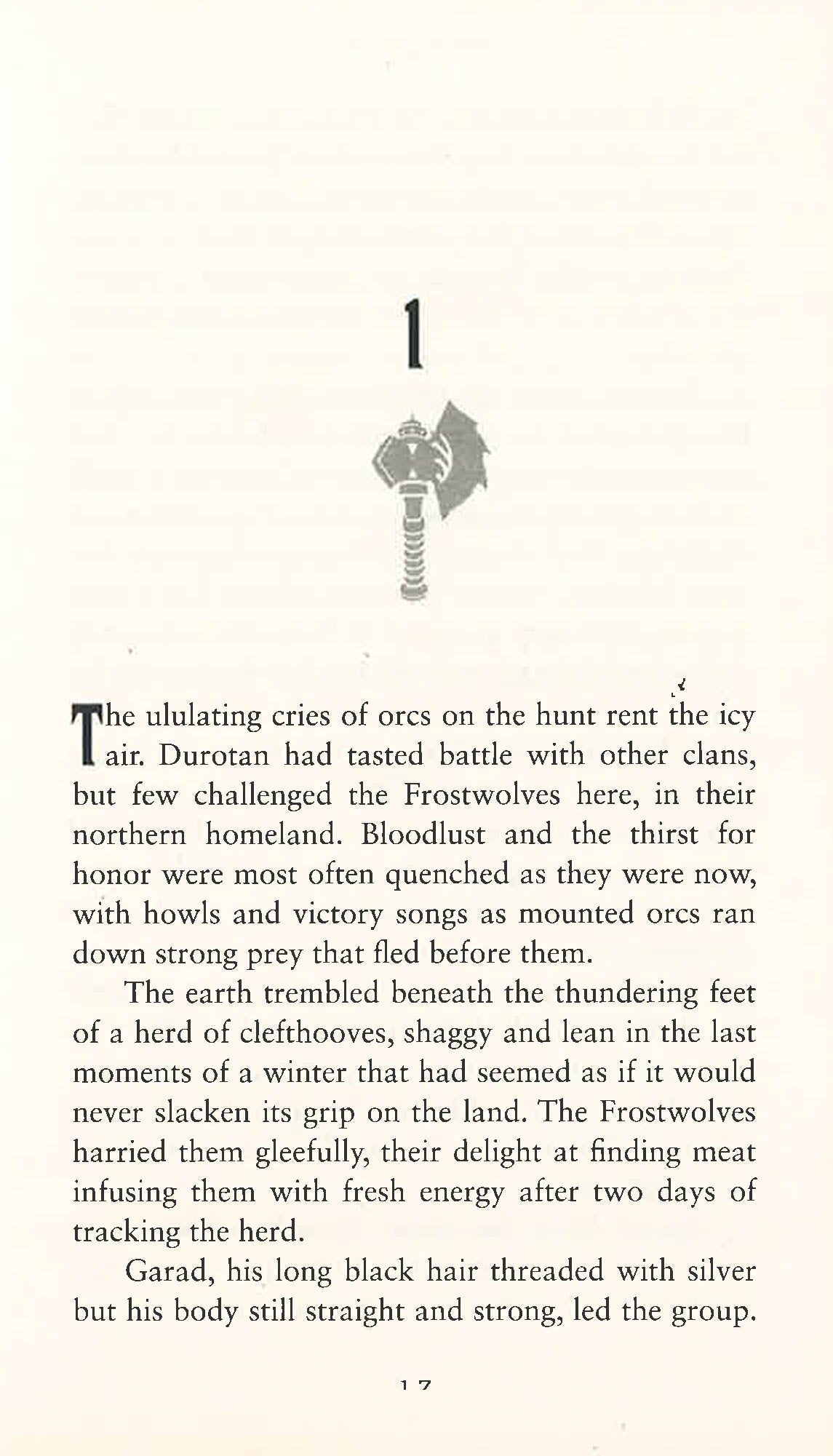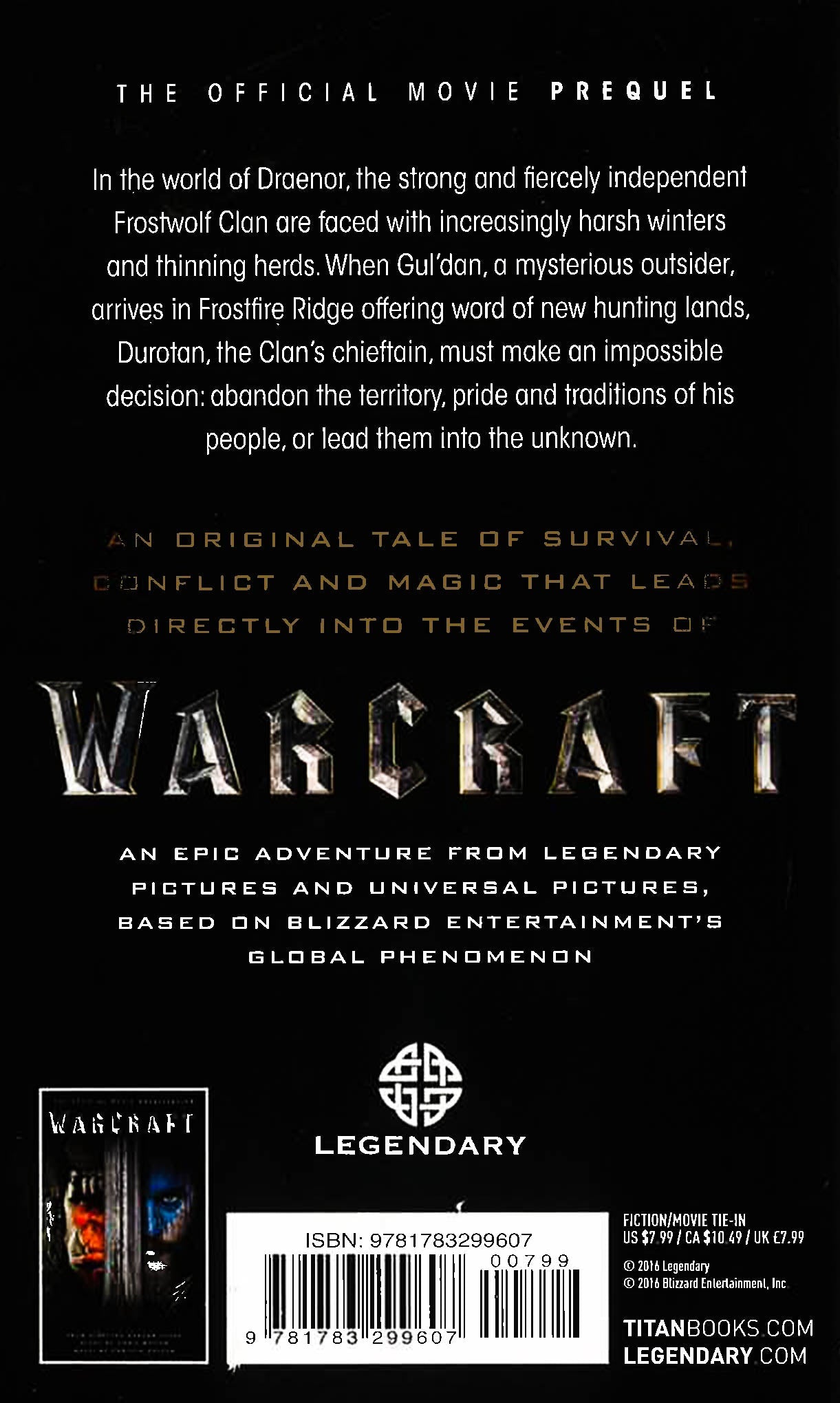 In the world of Draenor, the strong and fiercely independent Frostwolf Clan are faced with increasingly harsh winters and thinning herds. When Gul'dan, a mysterious outsider, arrives in Frostfire Ridge offering word of new hunting lands, Durotan, the Clan's chieftain, must make an impossible decision: abandon the territory, pride and traditions of his people, or lead them into the unknown. An original tale of survival, conflict and magic that leads directly into the events of Warcraft, an epic adventure from Legendary Pictures and Universal Pictures, based on Blizzard Entertainment's global phenomenon.
