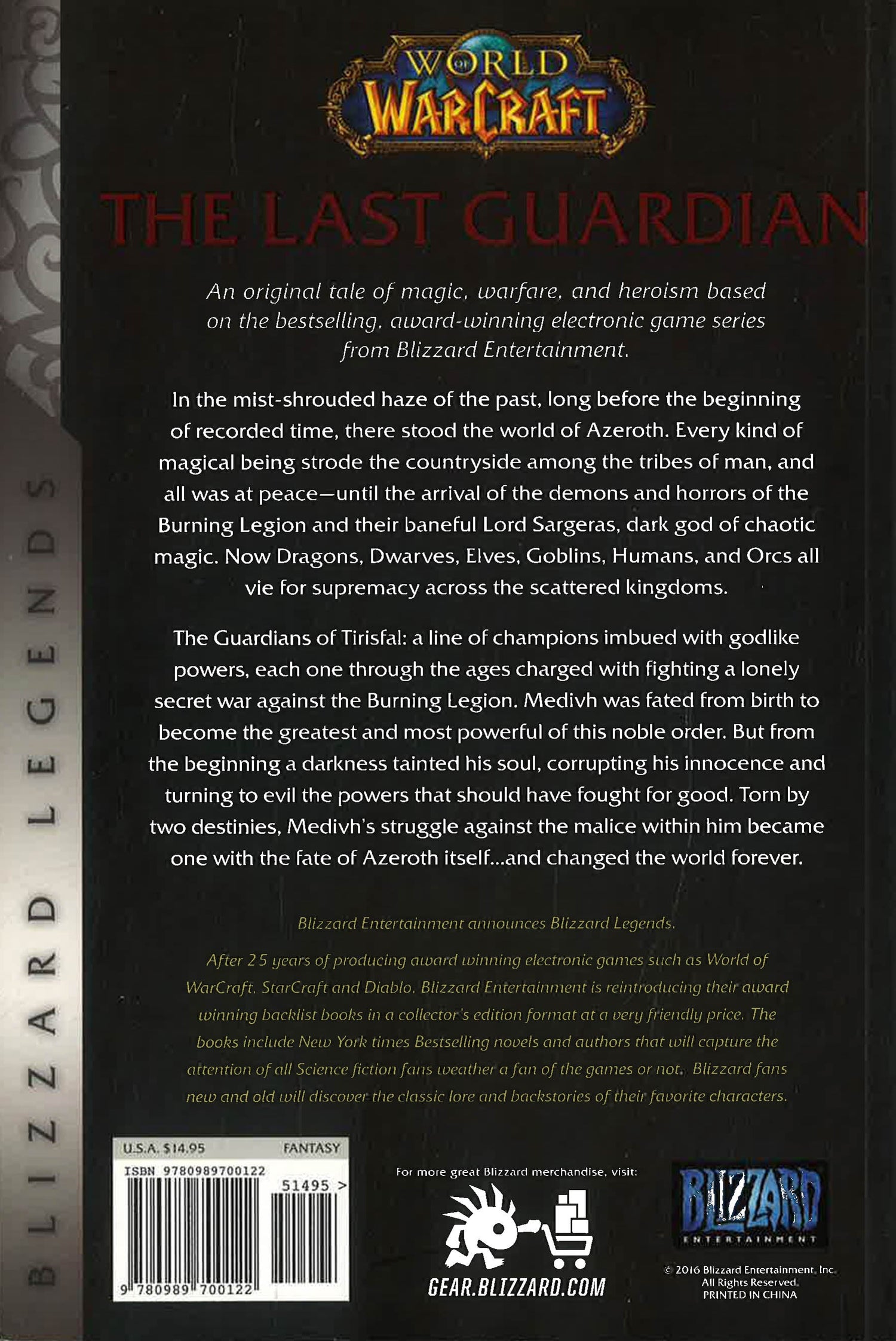 In the mist-shrouded haze of the past, long before the beginning of recorded time, there stood the world of Azeroth. Every kind of magical being strode the countryside among the tribes of man, and all was at peace — until the arrival of the demons and horrors of the Burning Legion and their baneful Lord Sargeras, dark god of chaotic magic. Now Dragons, Dwarves, Elves, Goblins, Humans, and Orcs all vie for supremacy across the scattered kingdoms -- part of a grand, malevolent scheme that will determine the fate of the world of The Guardians of Tirisfal: a line of champions imbued with godlike powers, each one through the ages charged with fighting a lonely secret war against the Burning Legion. Medivh was fated from birth to become the greatest and most powerful of this noble order. But from the beginning a darkness tainted his soul, corrupting his innocence and turning to evil the powers that should have fought for good. Torn by two destinies, Medivh's struggle against the malice within him became one with the fate of Azeroth itself...and changed the world forever.