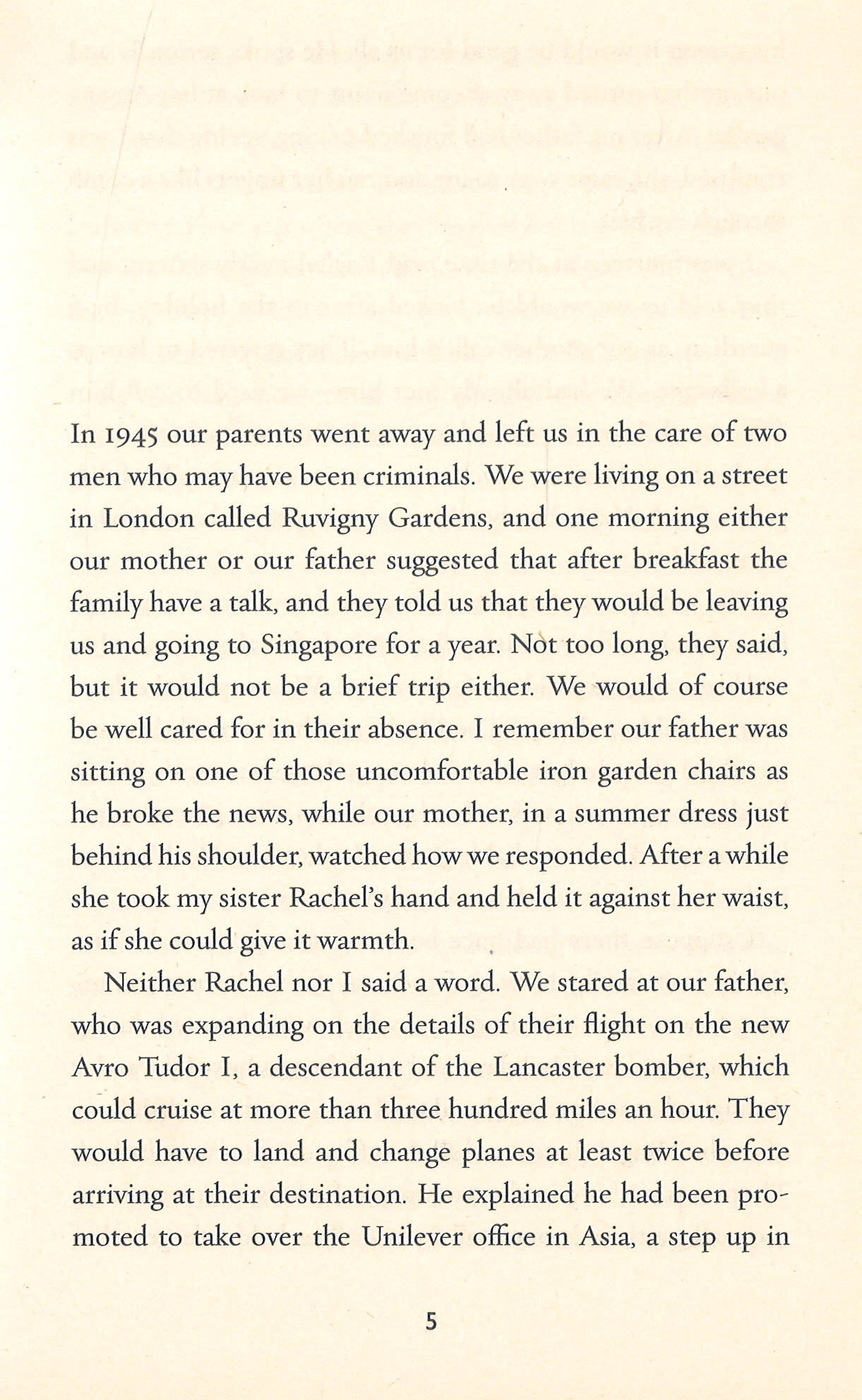 London, 1945. The capital is still reeling from the war. 14-year-old Nathaniel and his older sister Rachel are abandoned by their parents who leave the country on business, and are left in the dubious care of a mysterious figure named The Moth. Nathaniel is introduced to The Moth's band of criminal misfits and is caught up in a series of teenage misadventures, from smuggling greyhounds for illegal dog racing to lovers' trysts in abandoned buildings at night.