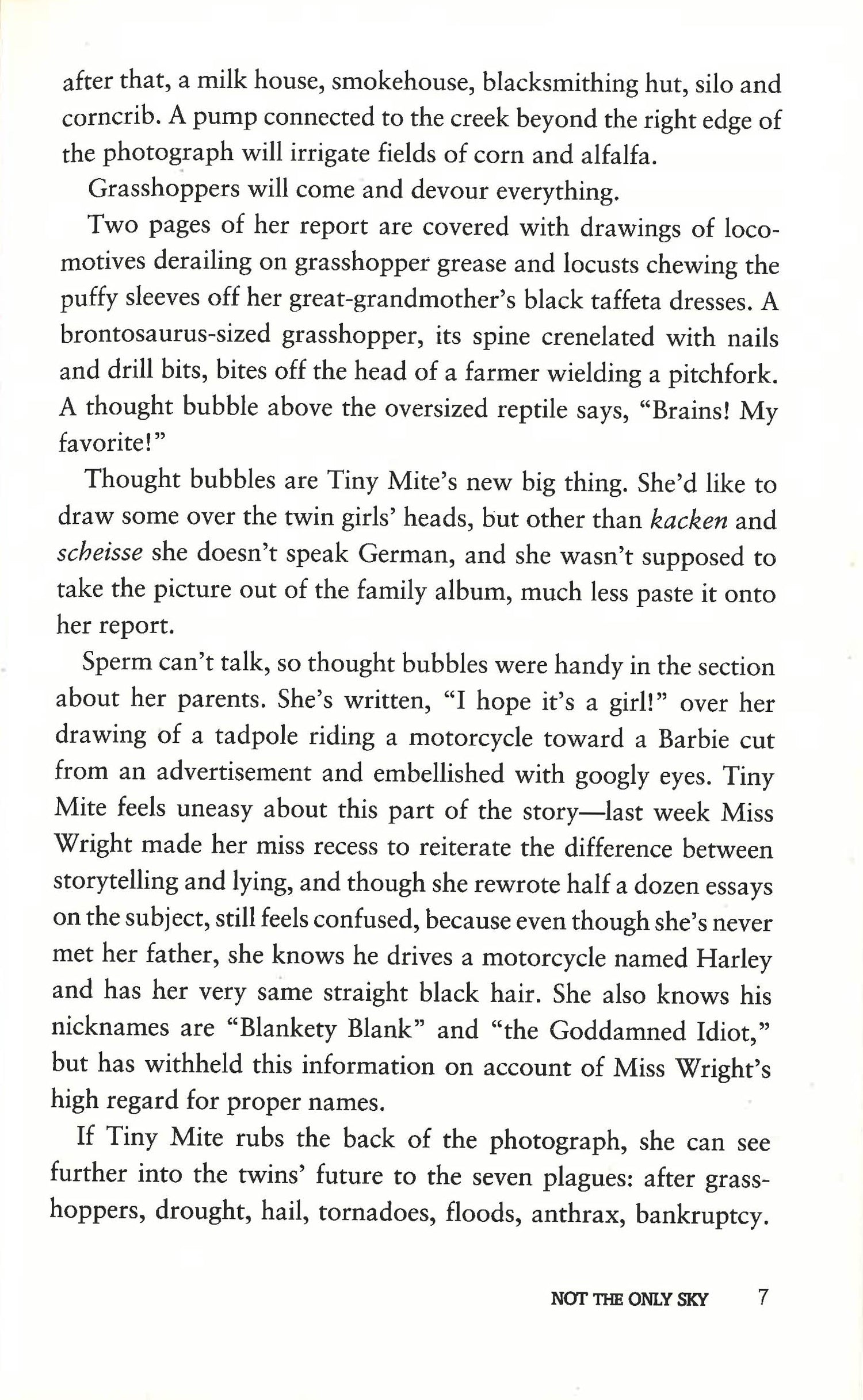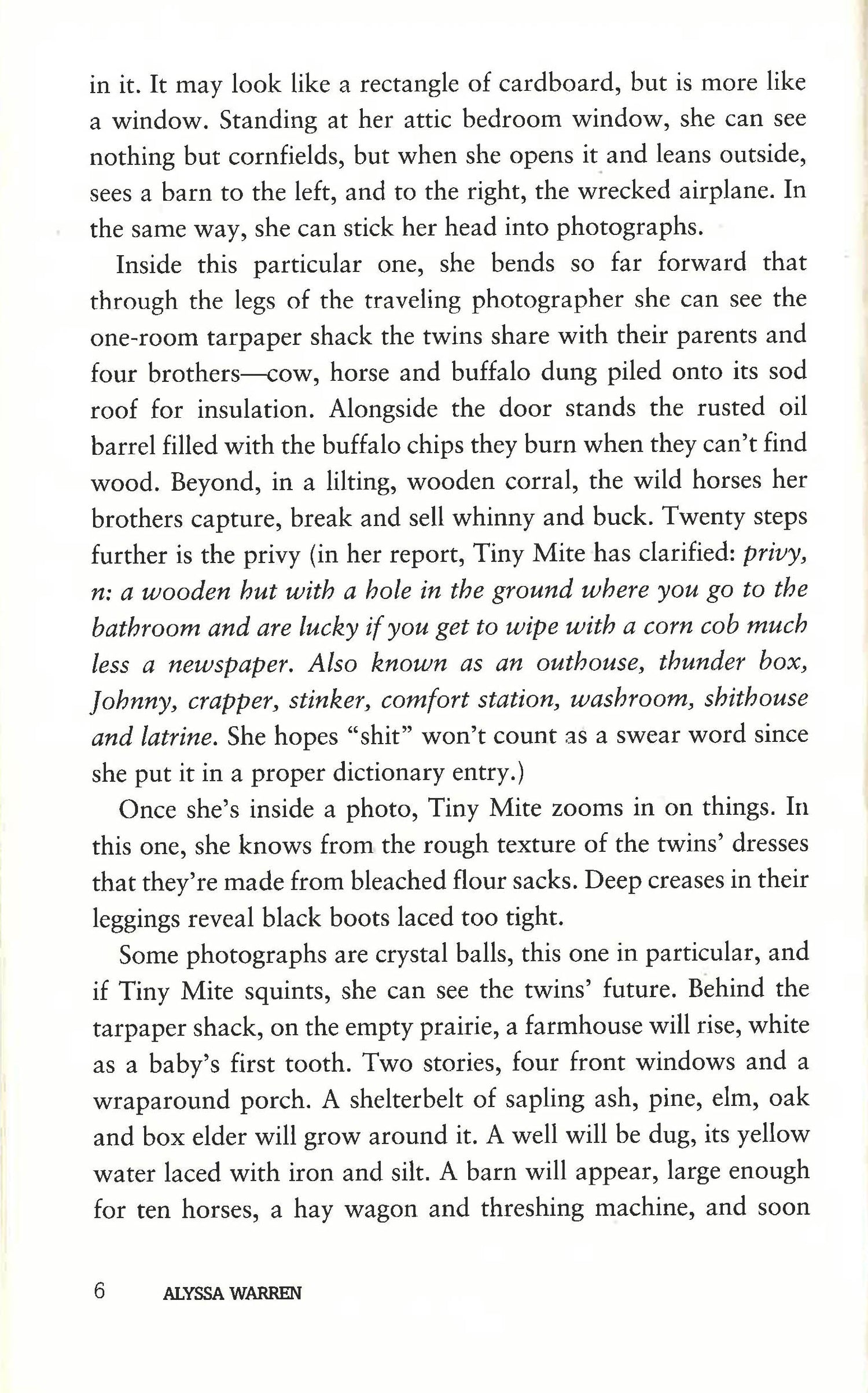 Wait. Patient. Now. Not long. Good girl. Wait here. Brave girl. Think of it as a vacation.' 'Back in a jiffy.' Big Bend, population 500, South Dakota, 1988. Eight-year-old Tiny Mite lives in a ramshackle farmhouse next to her grandfather's crashed airplane and the pine tree where she trains as a spy. Goddamn is her favourite word. Taking pictures with her camera made of aluminium foil and a tin can is her new big thing. She lives with Bee, her apocalypse-obsessed grandmother and Luvie, her hard-drinking great-aunt. And then there's her mother Velvet, beautiful and desperate, still in love with her high school boyfriend who she left to have a brief fling with Tiny Mite's absent father. One night, Tiny Mite hears a cry, but it's not what she imagines. And nothing will ever be the same. Six years later, Clea won't let anyone call her Tiny Mite anymore. Luvie has fallen in love with a pastor, and Bee's health is failing. Velvet is gone, and nobody except Bee, who can't bring herself to turn her back on her daughter, will even mention her name.Containing a wonderfully engaging and eccentric cast of characters who live long in the memory, this is the story of mothers and daughters, people bound by blood and geography, moments captured and lifetimes lost, and things never quite turning out as expected.