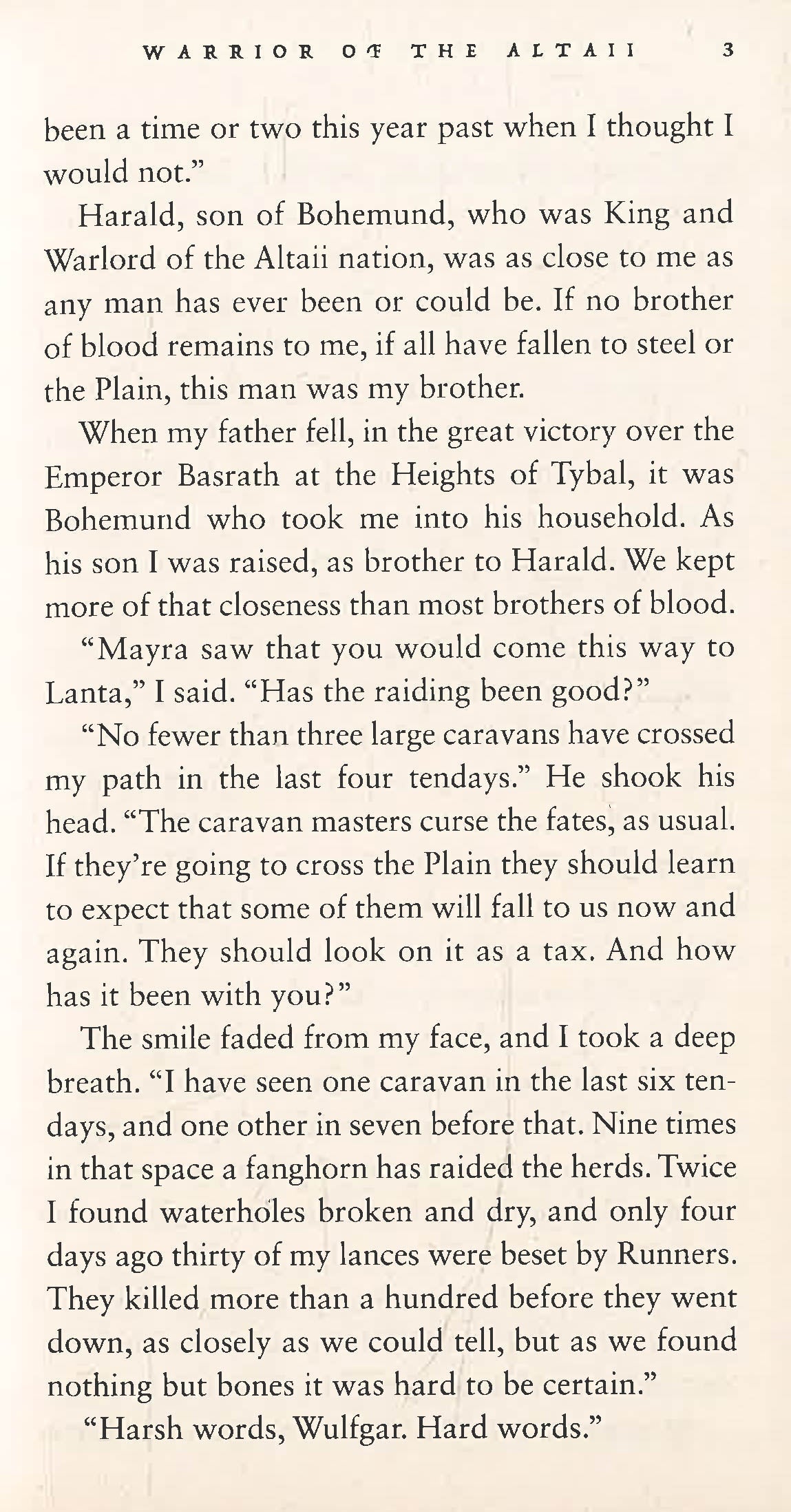 The watering holes of the Plain are drying up, the fearsome fanghorn grow more numerous, and bad omens abound. Wulfgar, a leader of the Altaii people, must contend with twin queens, warlords, prophets and magic in hopes of protecting his people and securing their future. Elspeth, a visitor from another world, holds the answers, but first Wulfgar must learn to ask the right questions.