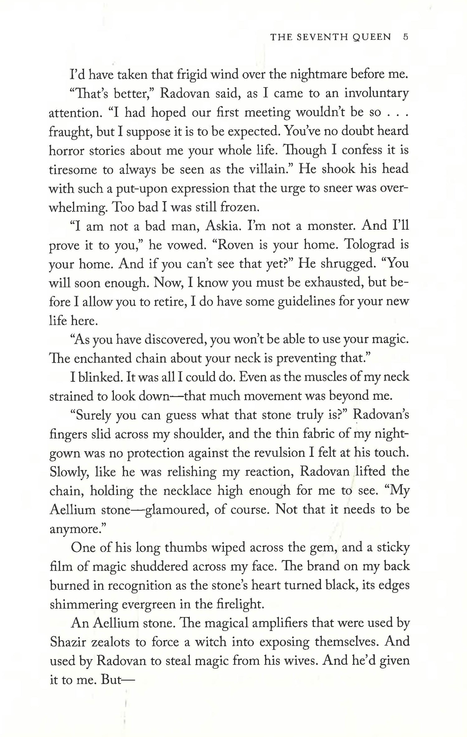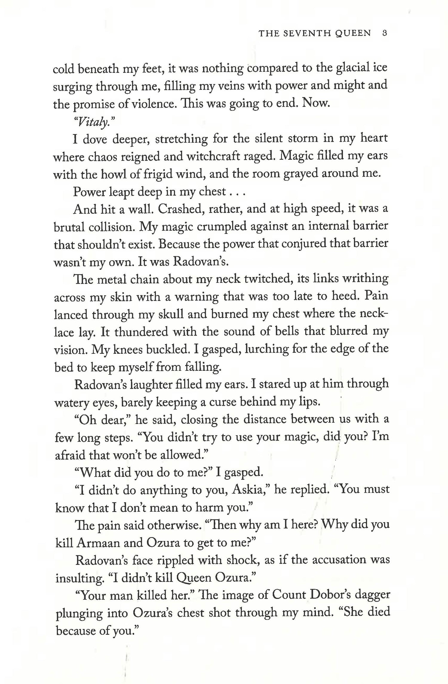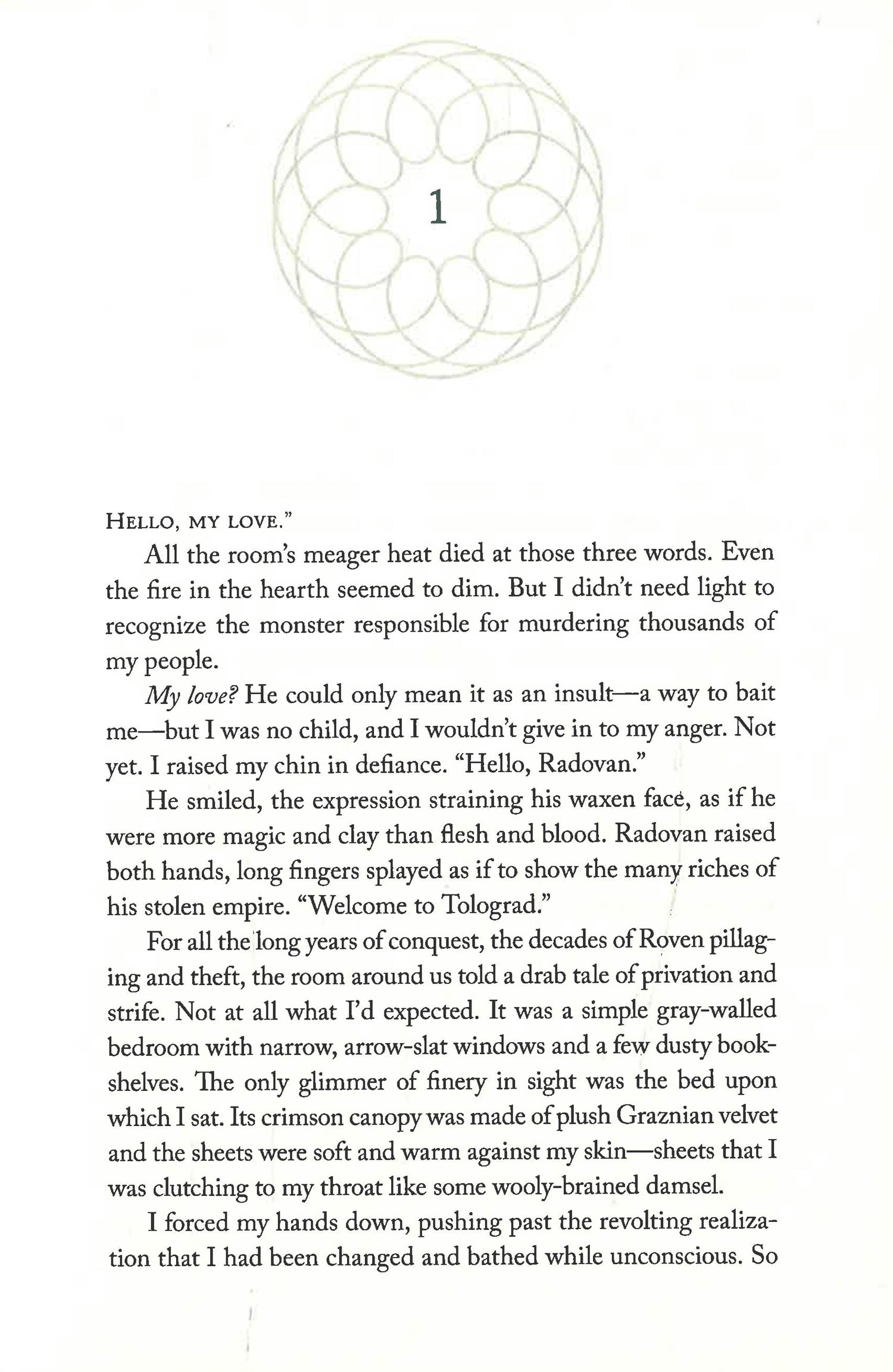 And time is a factor. The jewel Radovan has put around her neck will pull her power from her in thirty days. Worse, Vishir might not even have that long, as the two heirs to the throne are on the verge of civil war. Without any hope for help from the south, without any access to her magic, alone in a hostile land, Askia is no closer to freeing her people than she was when she fled to Vishir. In the clutches of a madman, the only thing she’s close to is death.