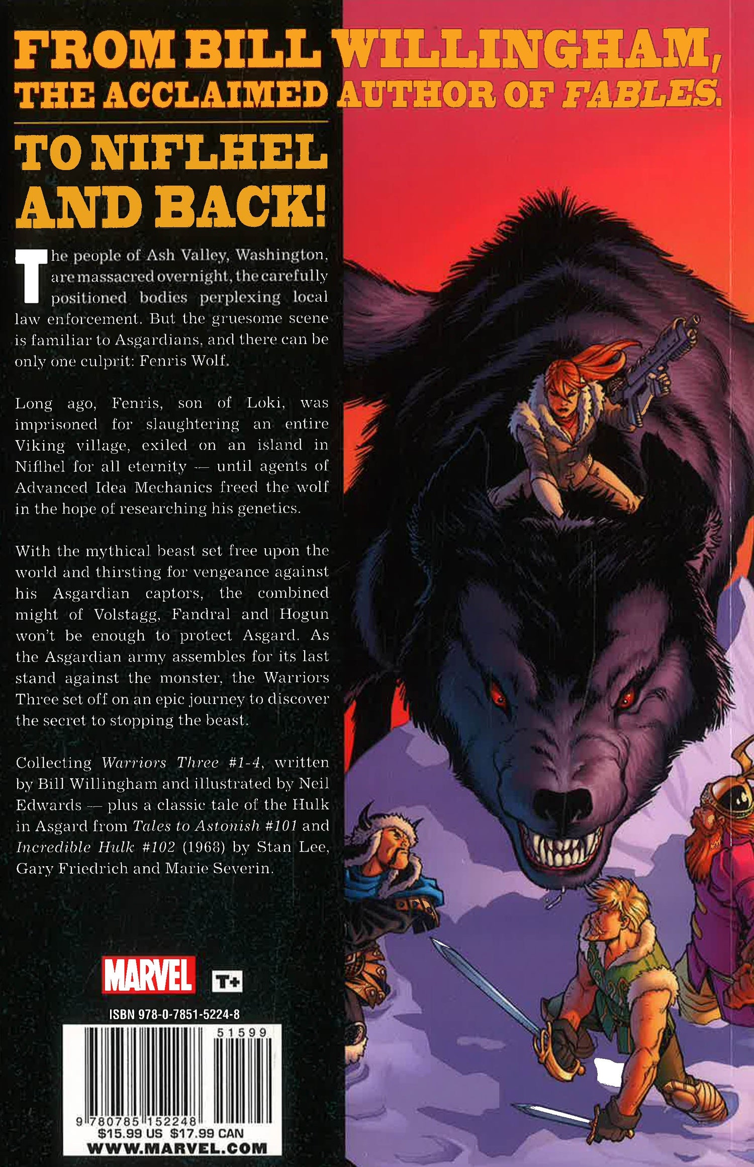 The town of Ash Valley, Washington is massacred overnight, the carefully positioned bodies perplexing local law enforcement. But the gruesome scene is familiar to Asgardians, and there can be only one culprit: the Fenris Wolf. Long ago, Fenris, son of Loki, was imprisoned for slaughtering an entire Viking village, chained away on an island in Niflhel for all eternity - until agents of Advanced Idea Mechanics freed the wolf in the hope of researching his genetics. With the mythical beast set free upon the world and thirsting for vengeance against his Asgardian captors, the combined might of Volstagg, Fandral and Hogun won't be enough to protect Asgard. As the Asgardian army assembles for its last stand against the monster, the Warriors Three set off on an epic journey to discover the secret to stopping the beast. Plus: a classic tale of the Hulk in Asgard! Collecting WARRIORS THREE #1-4, the Hulk story from TALES TO ASTONISH #101 and INCREDIBLE HULK (1968) #102.