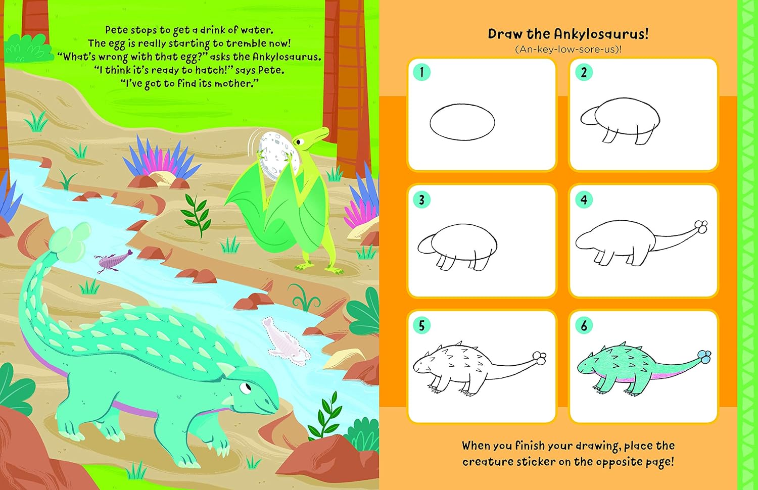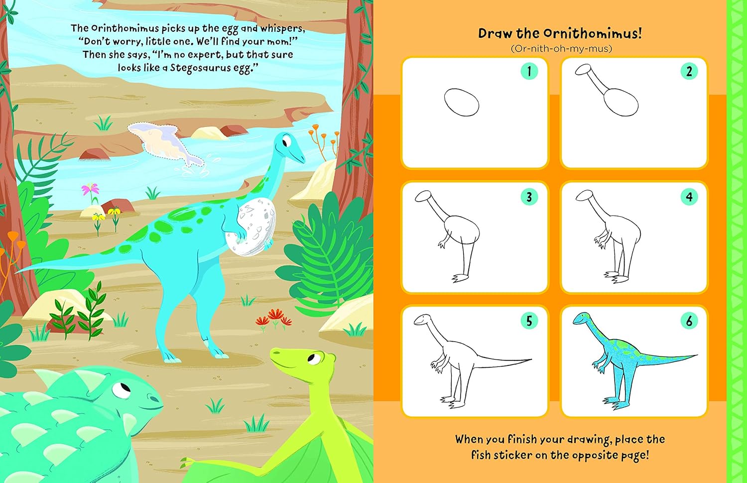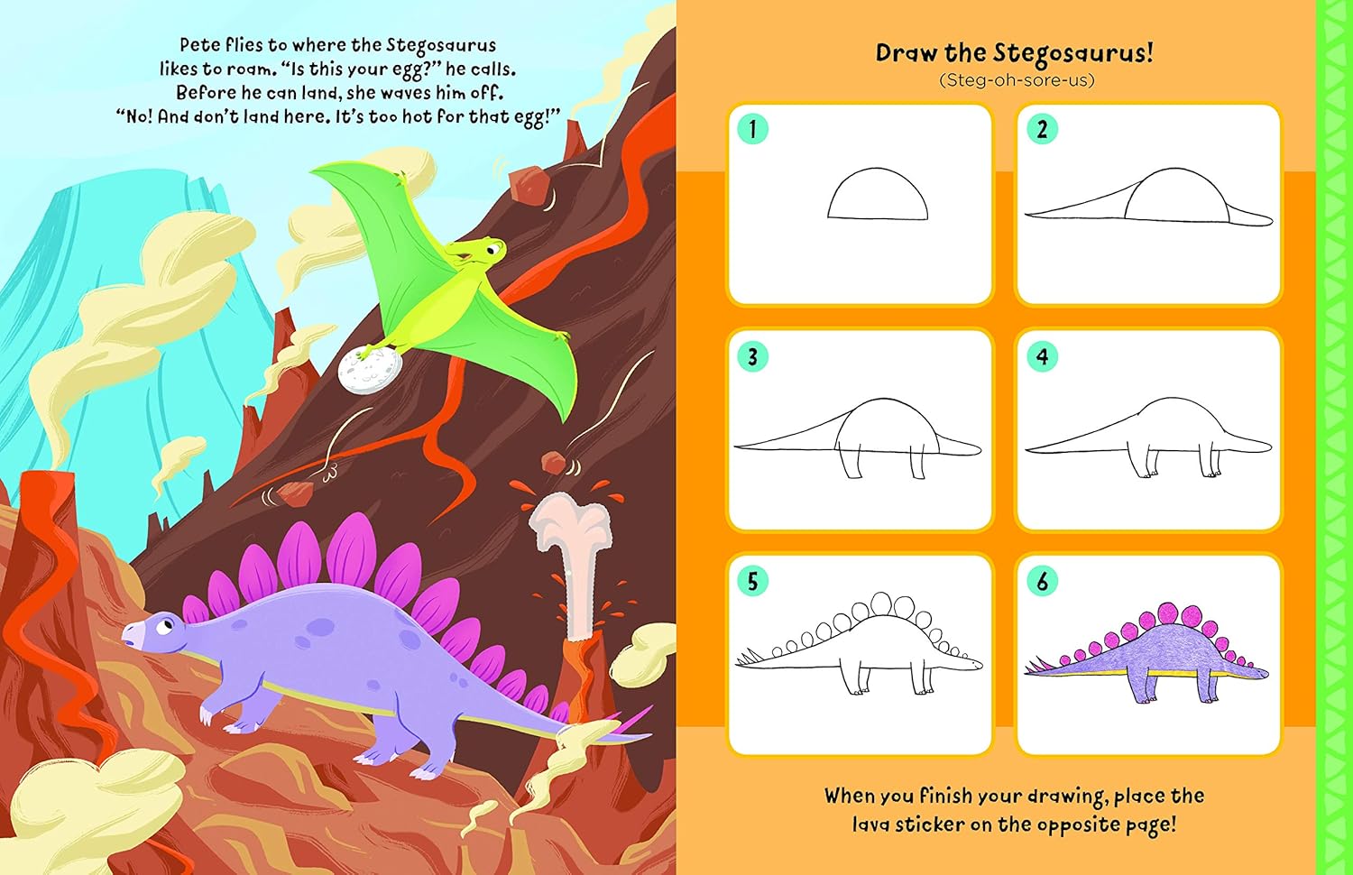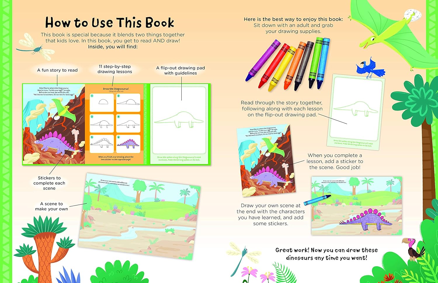 Each page features easy-to-follow instructions so young artists can draw all of the dinosaurs from the story, one step at a time. Basic shapes that kids will recognize make it easy to follow along and learn how to draw. The flip-out drawing pad also offers drawing prompts and simple shapes for a jump-start, making it enjoyable and fun to draw favorite dinosaurs. Plus, there’s a whole bunch of colorful stickers inside to reward them as they complete the story along the way, and a prehistoric scene at the end to make their very own! It’s the perfect starter drawing book for kids who love to read and draw.